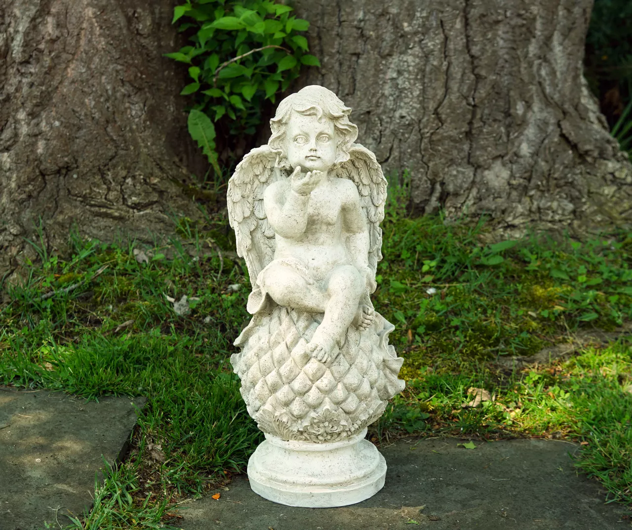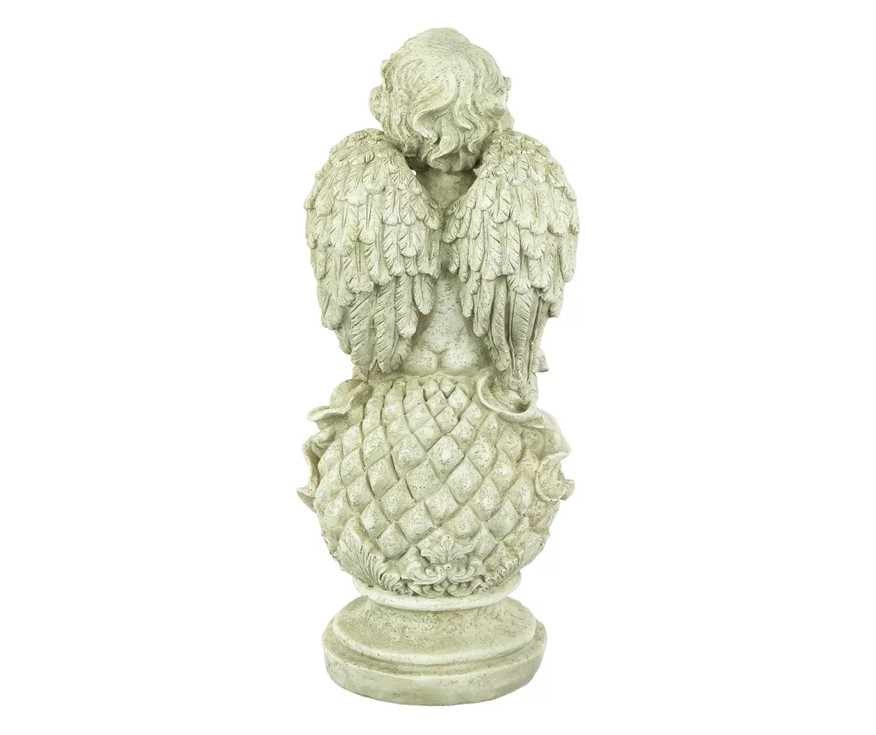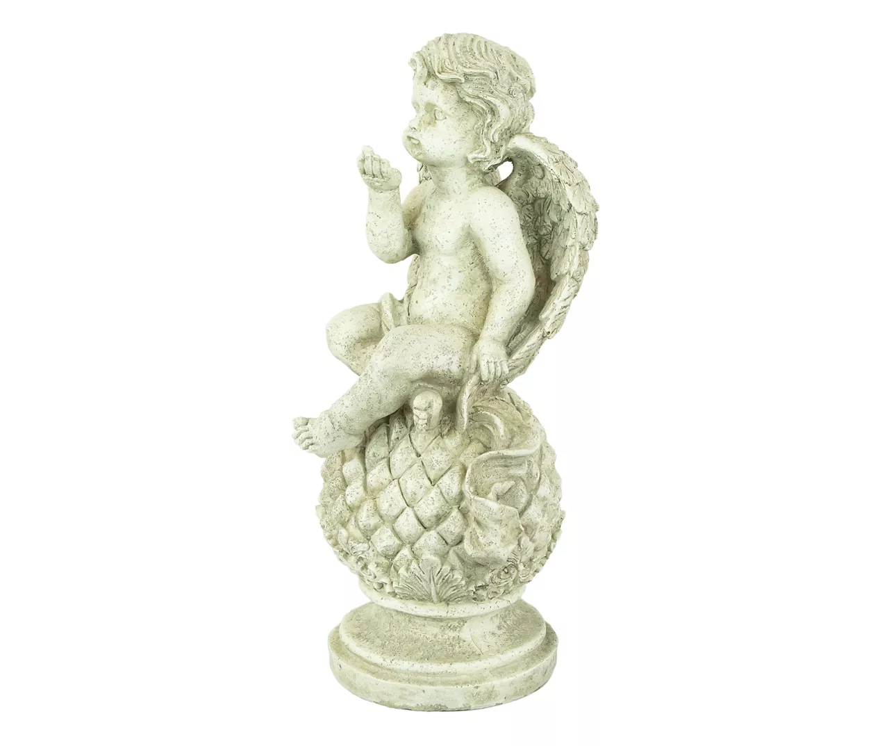 Young ones have a knack for reveling in life’s mysteries and baby angels are no exception. This cherub has intricate details from dimpled knees to feathered wings this angel sits atop a pine cone finial. This statue has a naturally aged appearance which adds a gorgeous vintage touch. With a sweet face this cute little cherub will make you smile as it adds whimsy to flower bed border or garden.