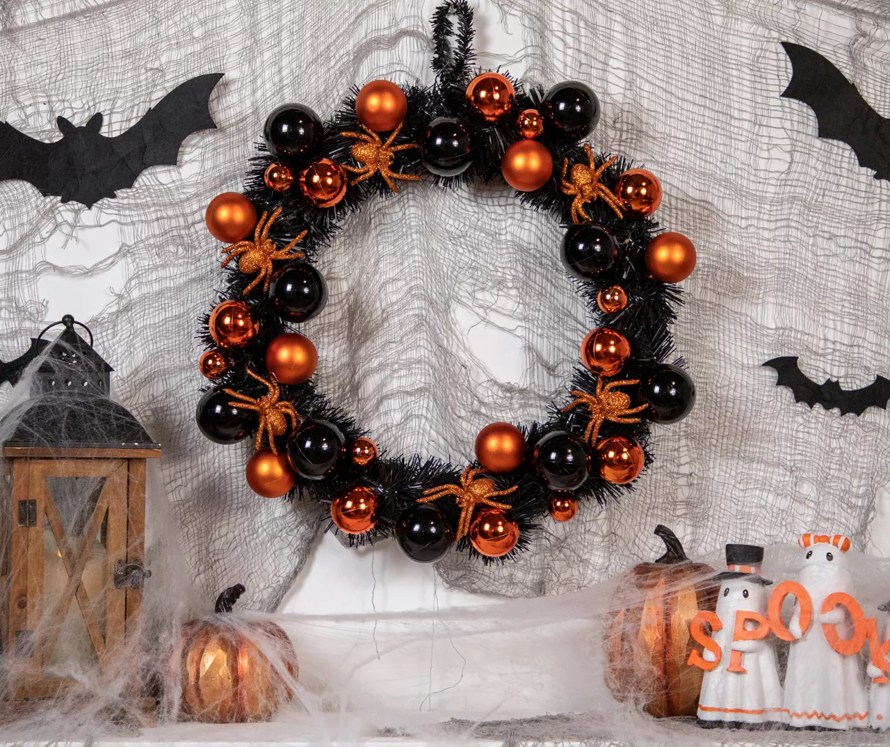 Spread a Halloween vibe to your surroundings by hanging this wreath in your home. This spooky black wreath features orange glittered spiders with black and orange ornaments. It’s a creepy crawly addition to a door, wall or window