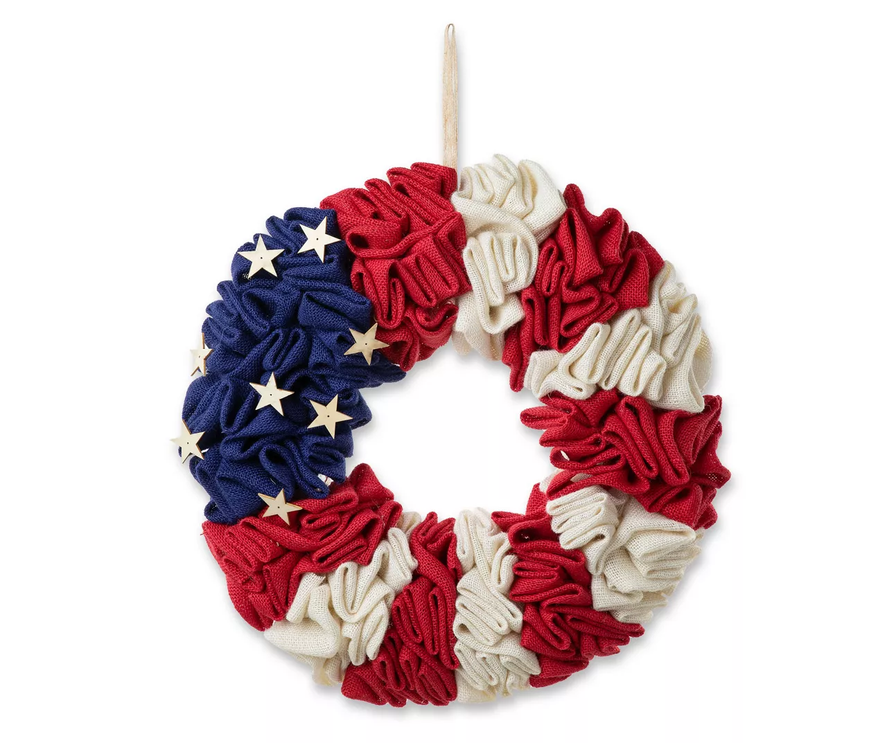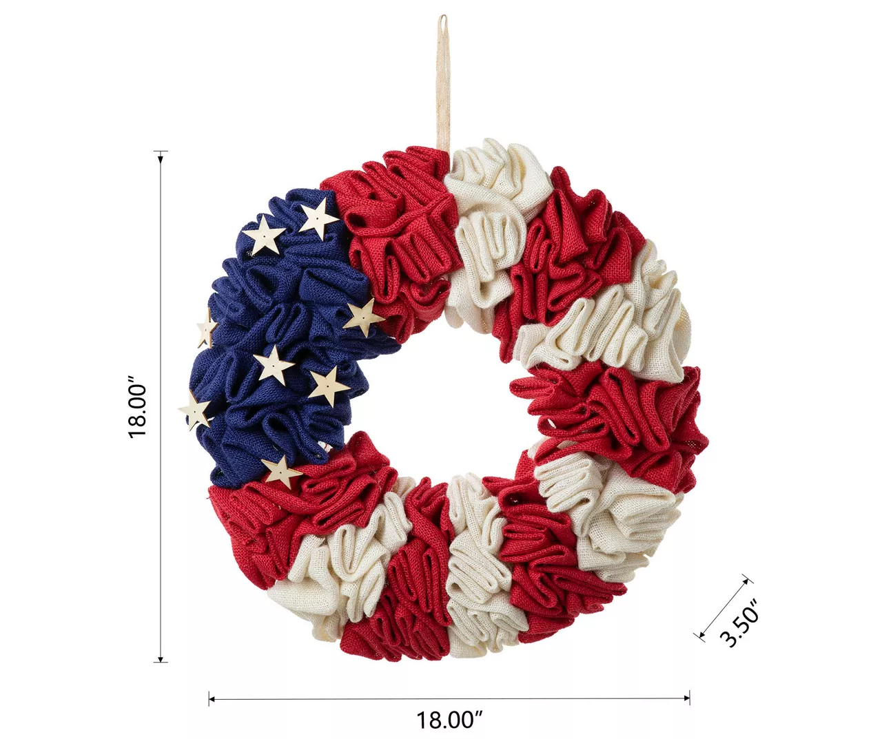 Celebrate America with this fabulous fabric wreath! Ruffled pieces are featured in U.S. flag red, white and blue and accented with stars. This wreath is a wonderful way to decorate for Independence Day.