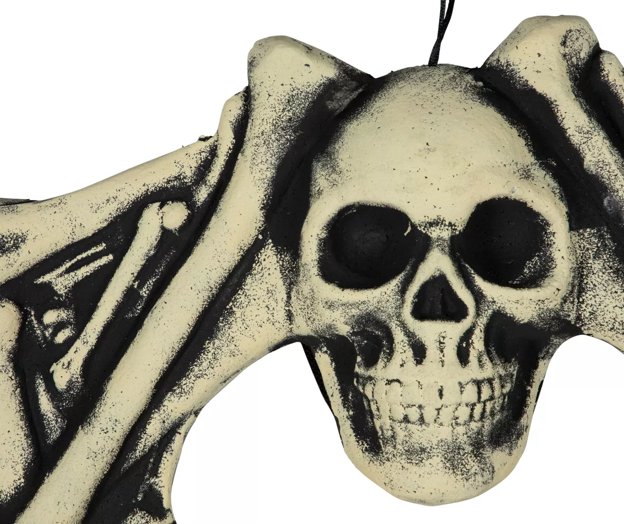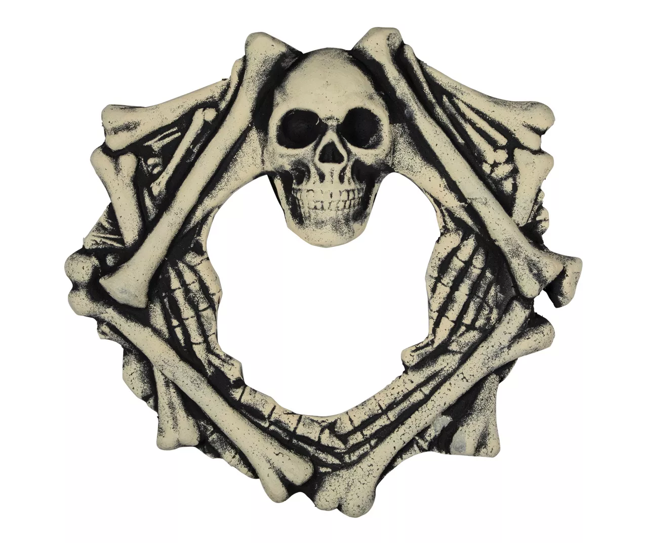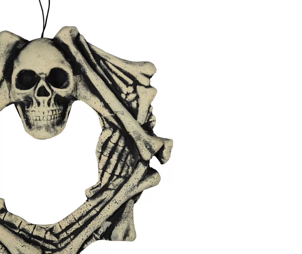 This horrifying skeleton wreath is the perfect addition to your Halloween decor. A spooky skeleton is twisted into a wreath shape. Ideal for a door, wall or as part of your terrifying holiday table centerpiece.