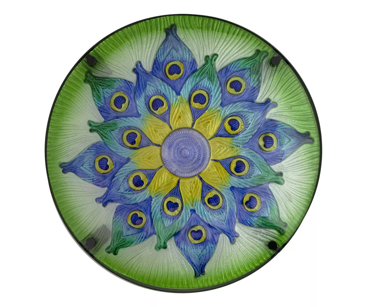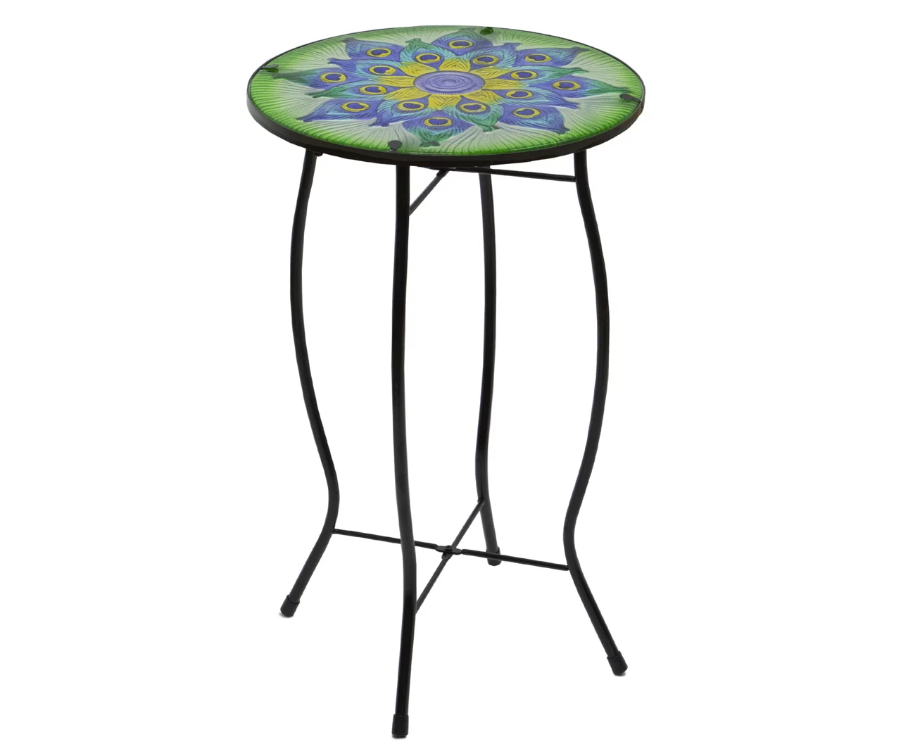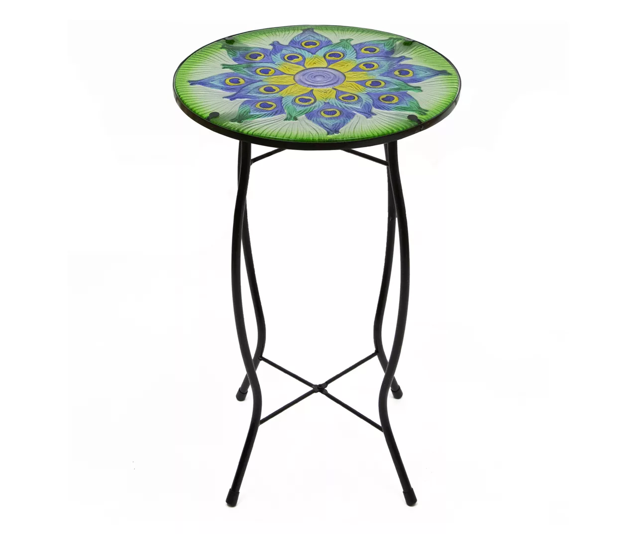 - Glass tabletop with a fanned peacock feather design