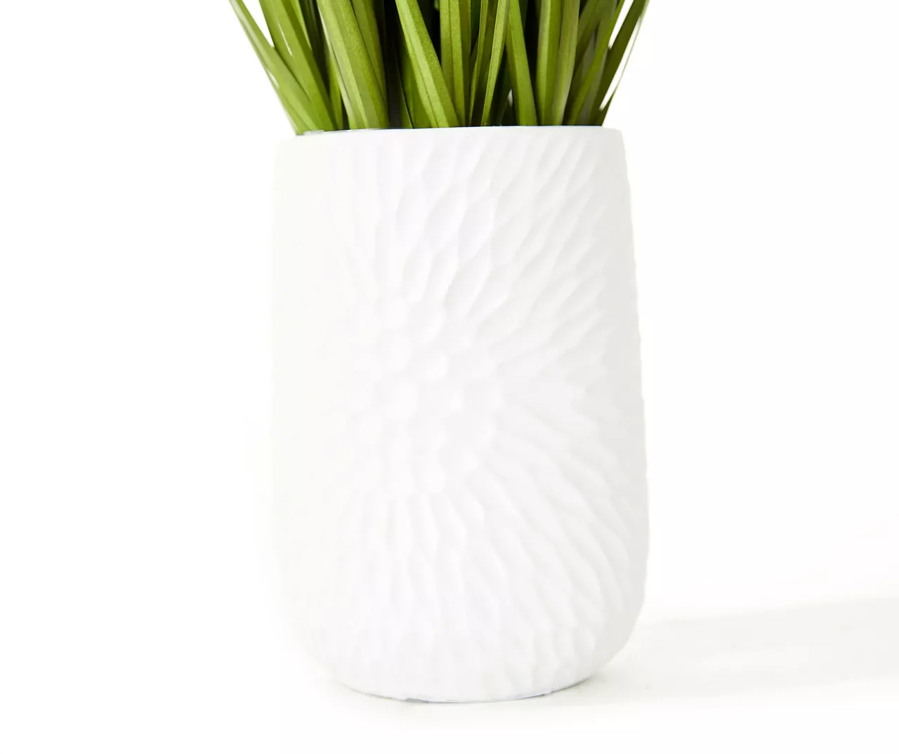 Bring a touch of nature to your home without the upkeep displaying this artificial plant. Tall strands of grass is featured within a unique ceramic planter with carved textures and a white finish. This worry-free plant arrangement is perfect for showcasing in a living area, entryway or kitchen.