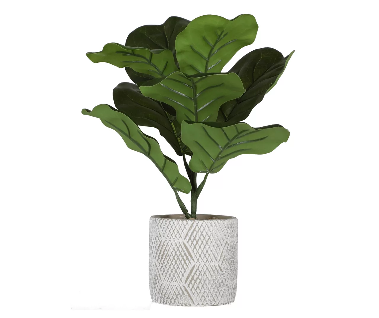 Bring a nature’s touch into your home without the upkeep displaying this artificial plant. A realistic fiddle fig plant is featured within a round cement pot accented with a hexagon hatch line pattern. This maintenance-free plant is a great addition to a mantel, table or shelf.