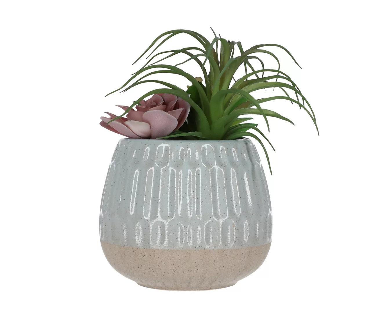 This artificial plant brings an exotic touch to your home with no green thumb required! An arrangement of realistic succulents is featured within a round two-tone pot with carved detailing around the sides. This maintenance-free display is a great addition to a mantel, table or shelf.