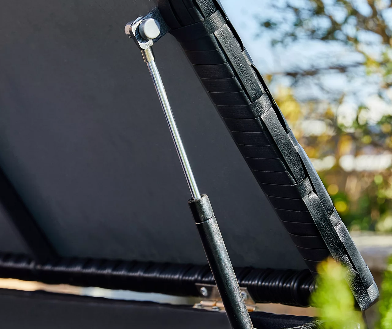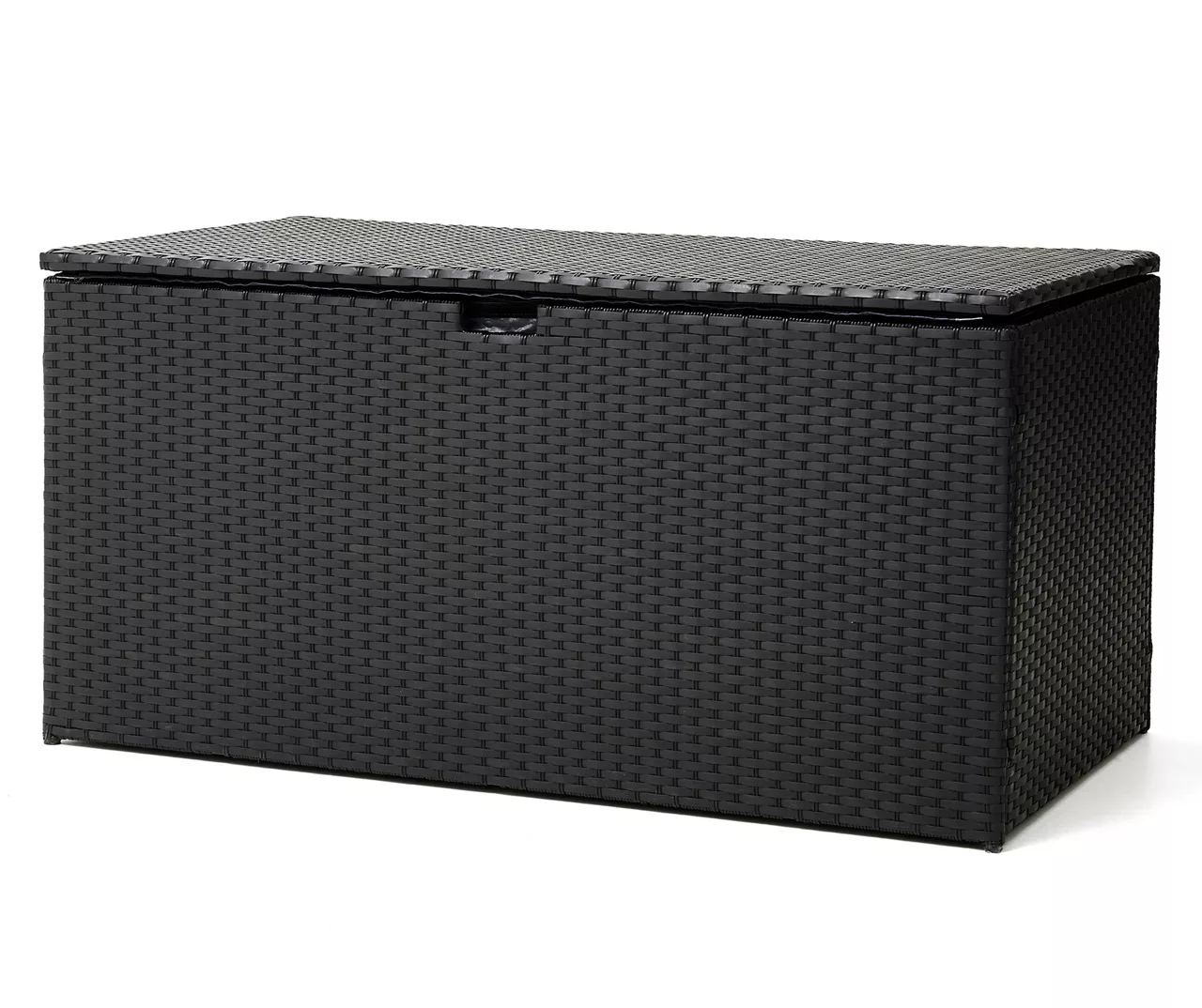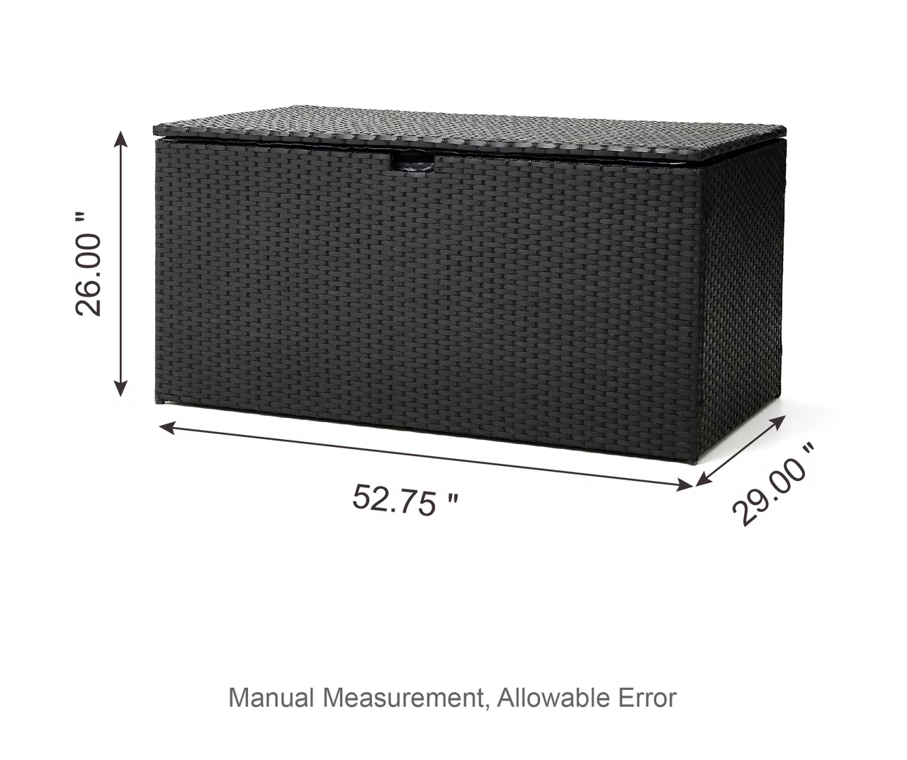 Store your outdoor cushions, pillows, toys and more in style with this outdoor storage box. It’s made with an anti-rust steel frame that is durable and sturdy and covered in a decorative handwoven all-weather wicker featuring a black look. A gas lift mechanism raises the lid with soft closing as the included Oxford liner keeps items from getting wet inside.