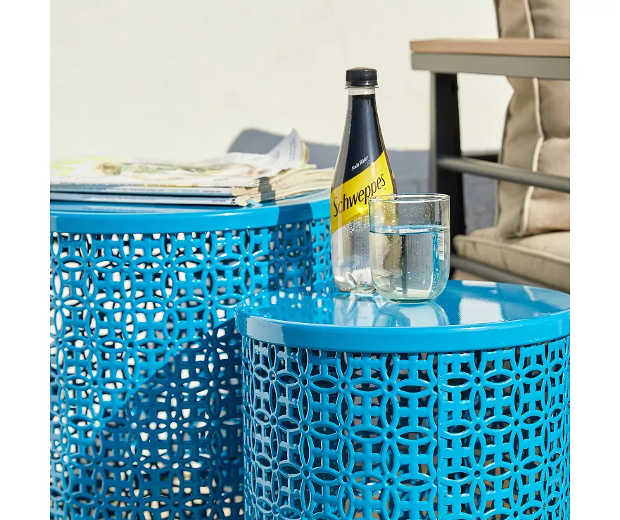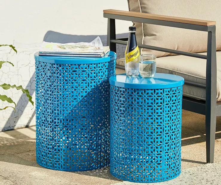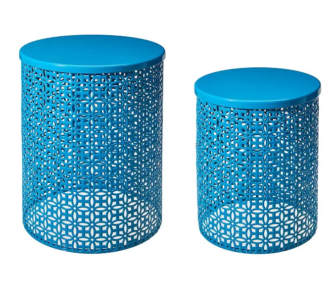 Transform your outdoor living space with this modern garden table set from Glitzhome. Each table features a round silhouette in blue with a cutout pattern along its sides. Use these tables as a planter stand or let them act as accent tables next to furniture on the patio, deck or porch.