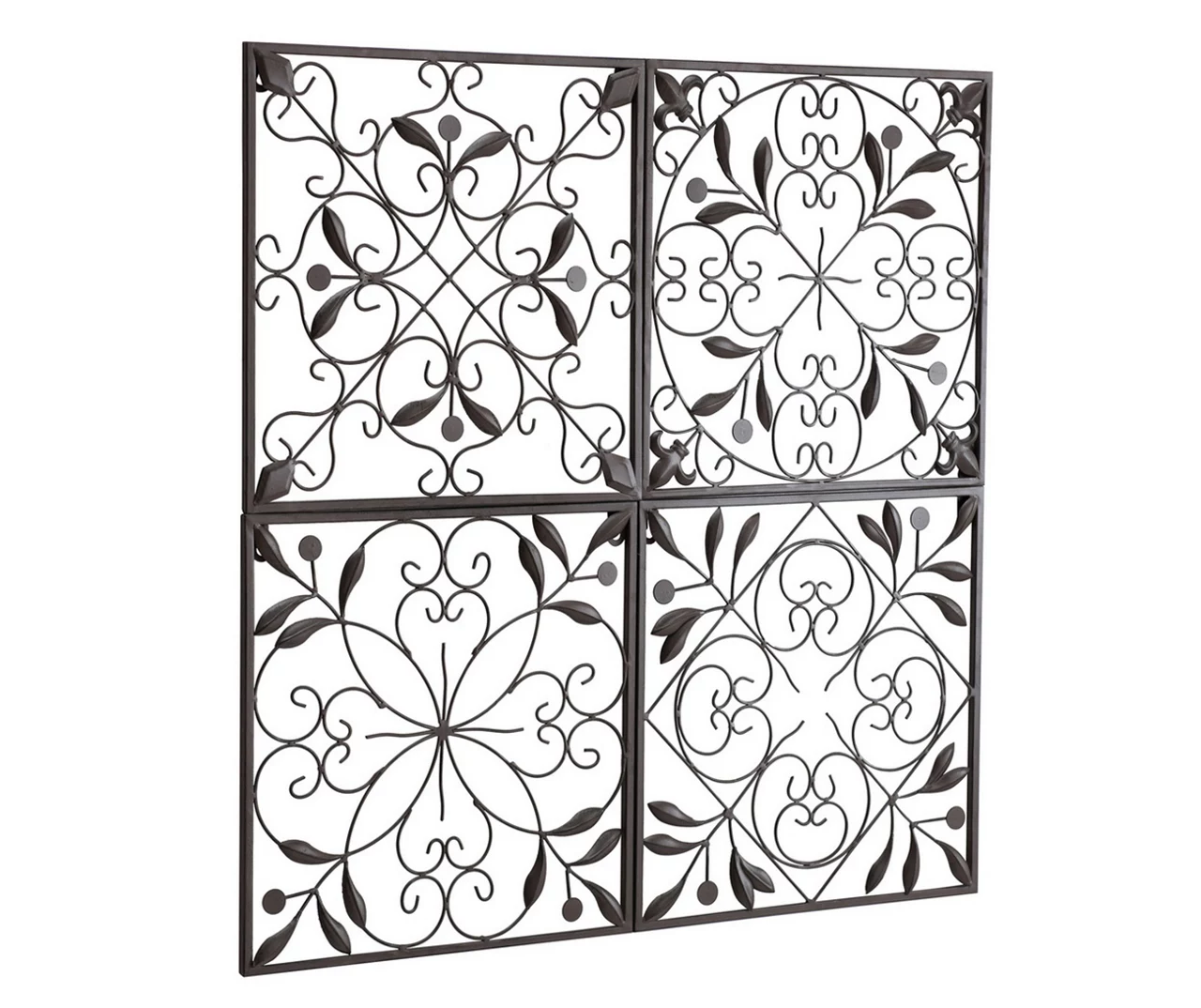 Make a statement on your walls with this elegant filigree metal wall art. Constructed of durable metal with a deep bronze finish, the four square coordinating pieces are adorned with scallops and scrolls that make them a perfect addition to any antique or traditional style. Hang separately or in a group. However you use them, they are sure to make an eye-catching statement for your home.