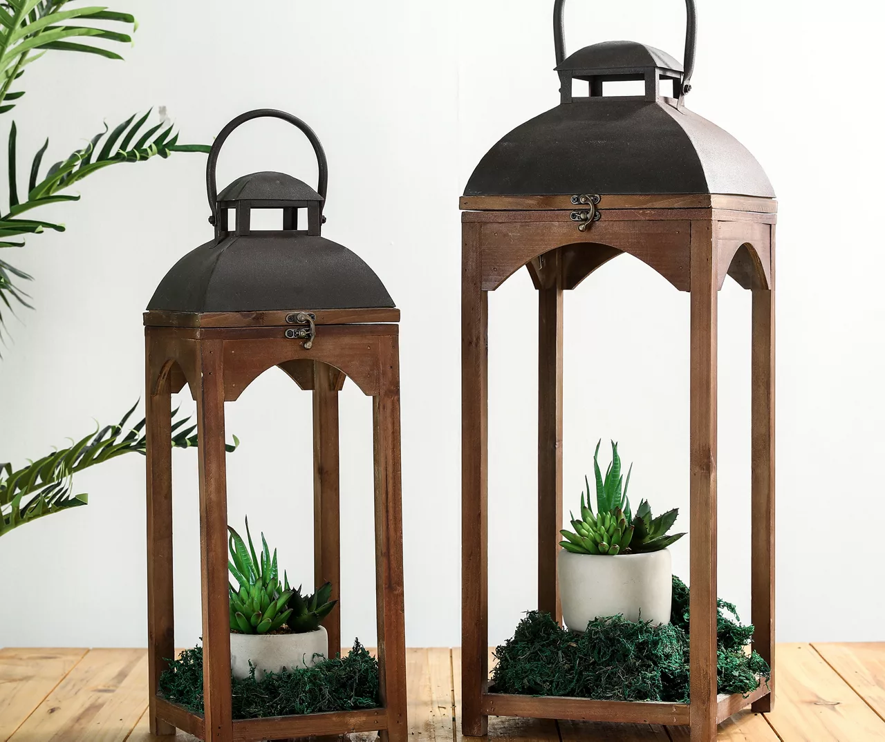 Add an elegant accent to your mantel and showcase LED pillar candles in this set of decorative lanterns. Display them together or stagger them throughout the space. They’re a wonderful addition to a mantel, countertop, covered front porch or any place you need a soft source of light.