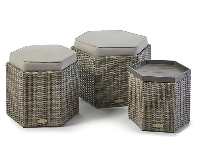 - Includes outdoor sofa with cushions, 2 loveseats with cushions, 2 side storage tables and 3 ottomans