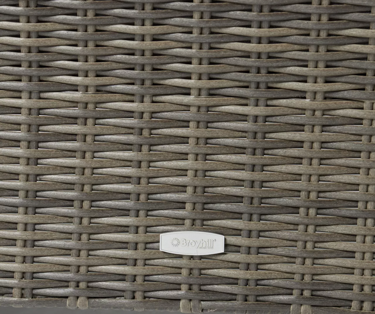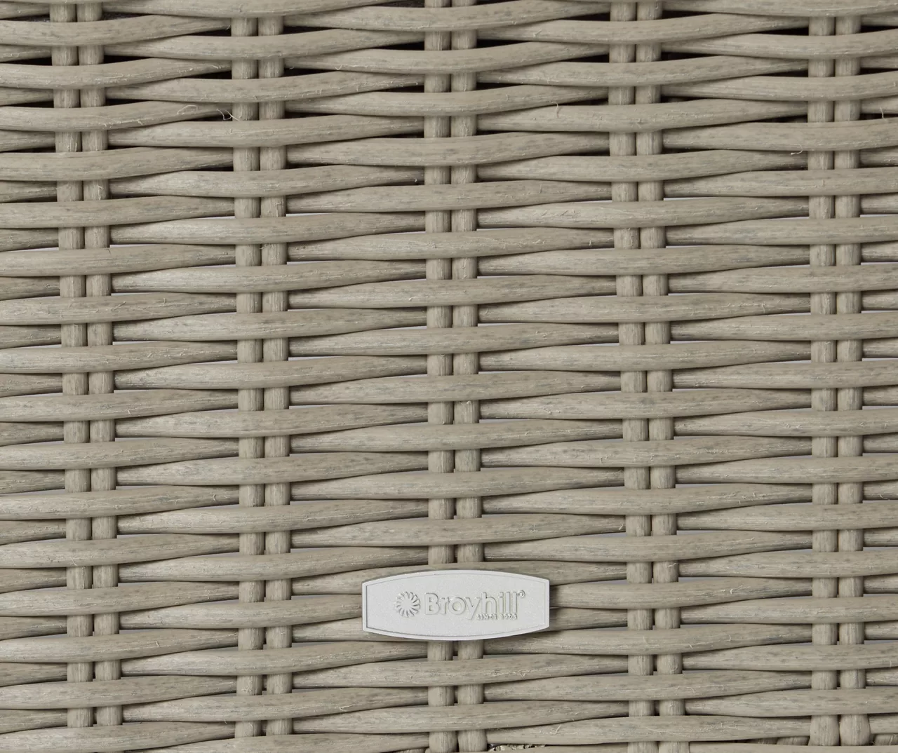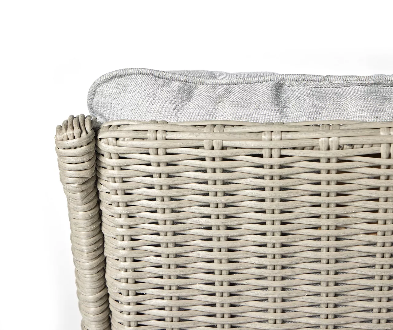 - Handwoven, half-round all-weather wicker along curved arms, backs and chair front