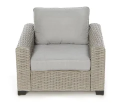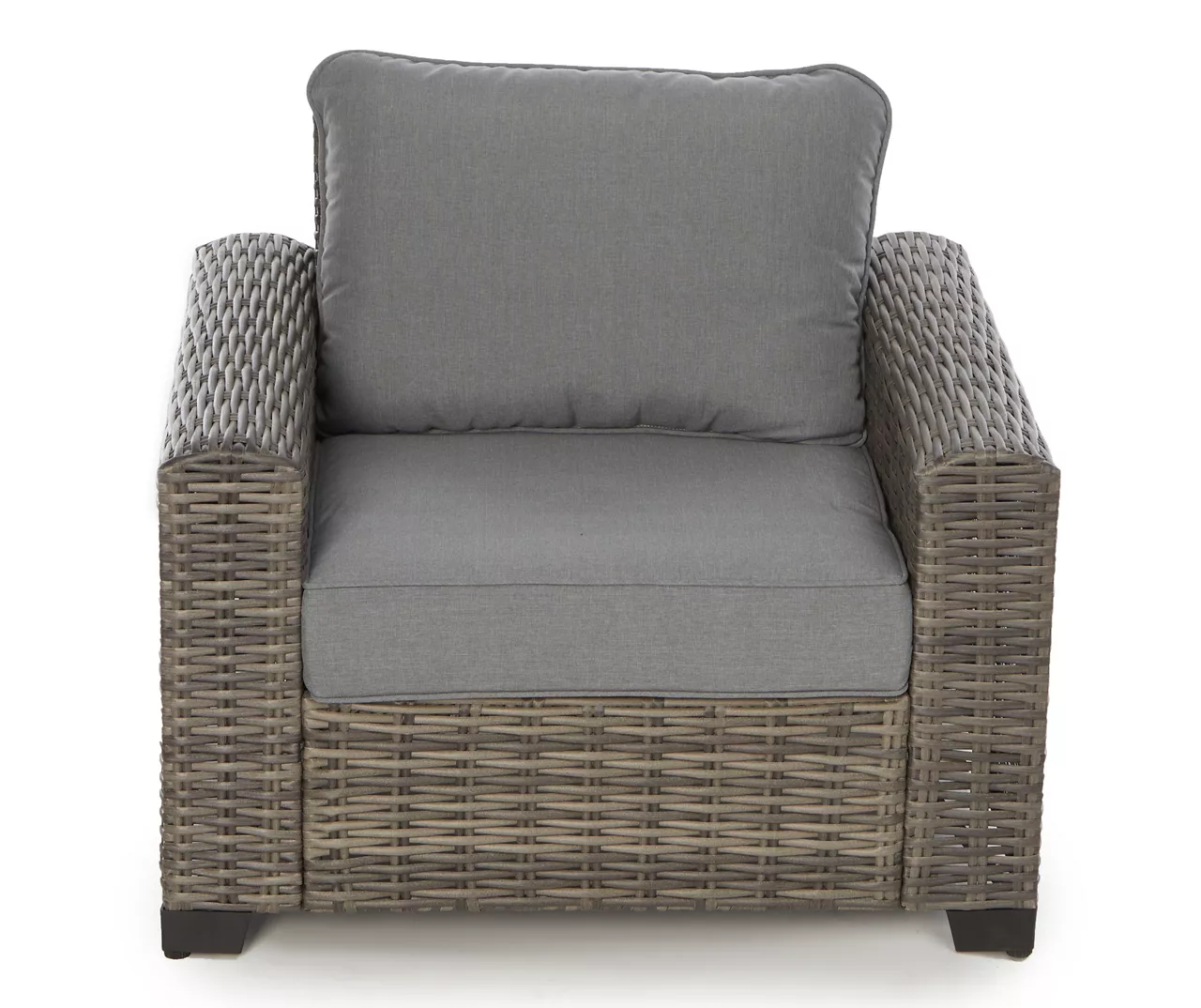 Gather outdoors in modern-inspired style with the Pembroke lounge chair by Broyhill. The armchair exudes design with a clean-line profile constructed with rounded track style arms and back in a half-round, handwoven all-weather wicker. Deep, oversize seating and pillow back cushions are made of fade-resistant olefin fabric in a neutral gray to provide a cozy, comfortable rest.