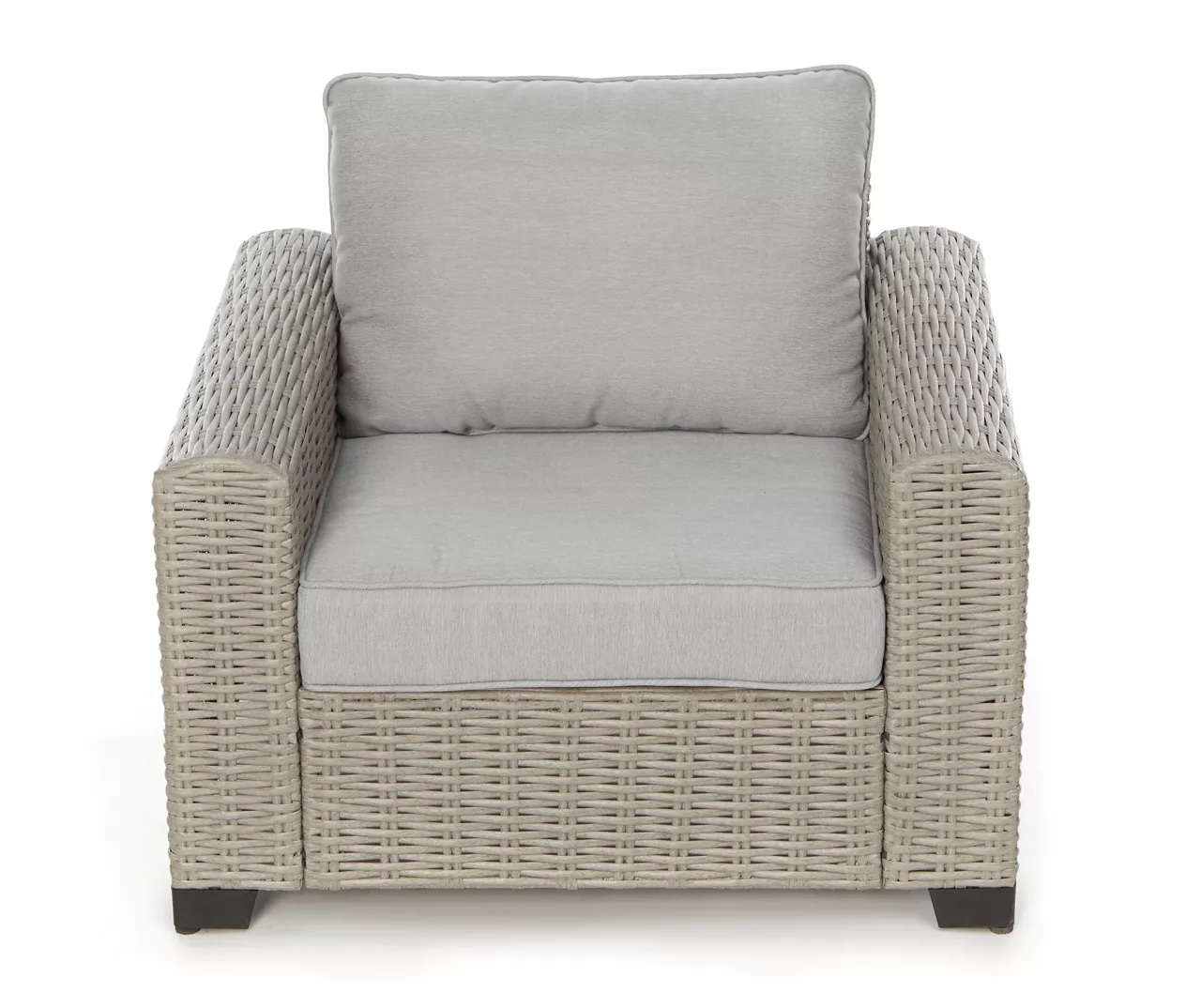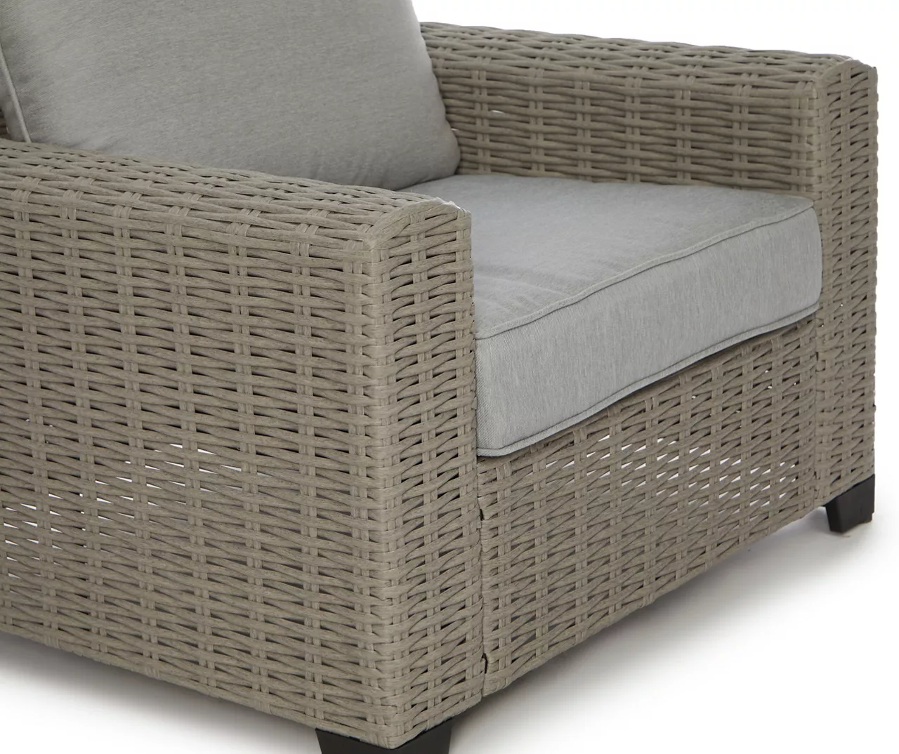 - Oversize deep seating cushions made from fade-resistant olefin fabric in gray