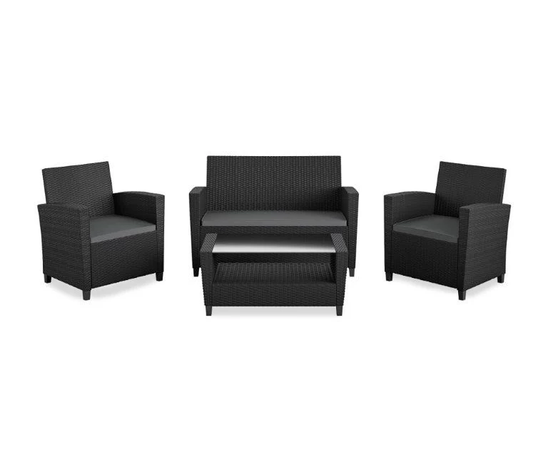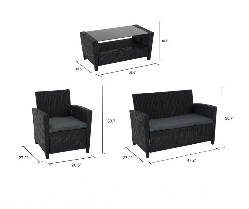 - Includes loveseat with cushions, 2 chairs with cushions and coffee table