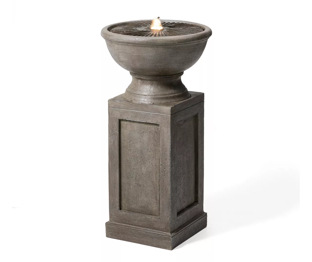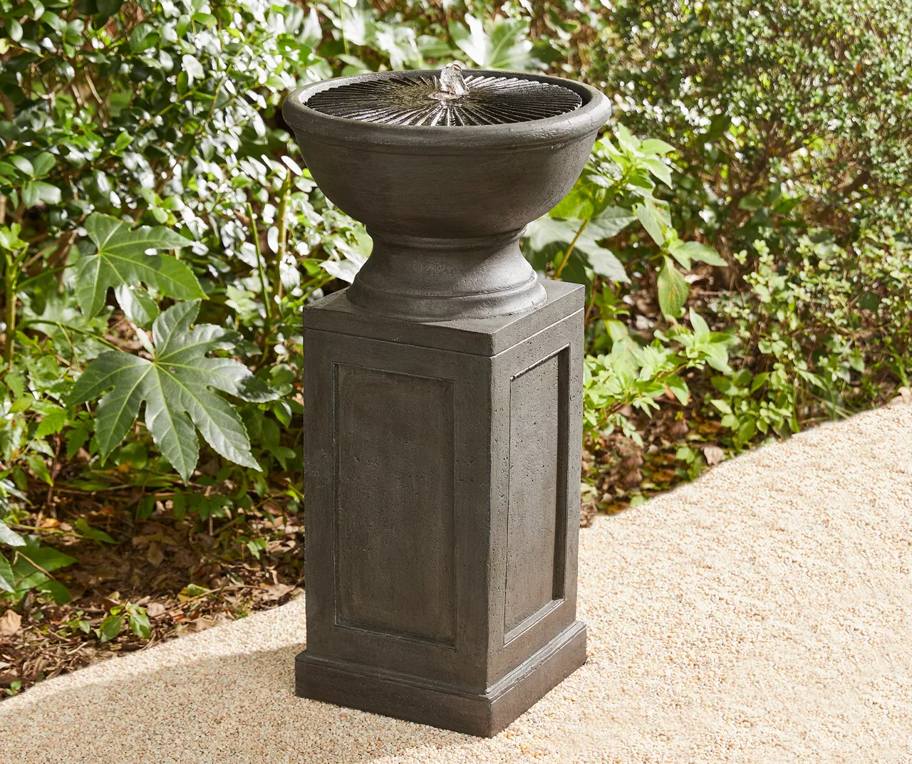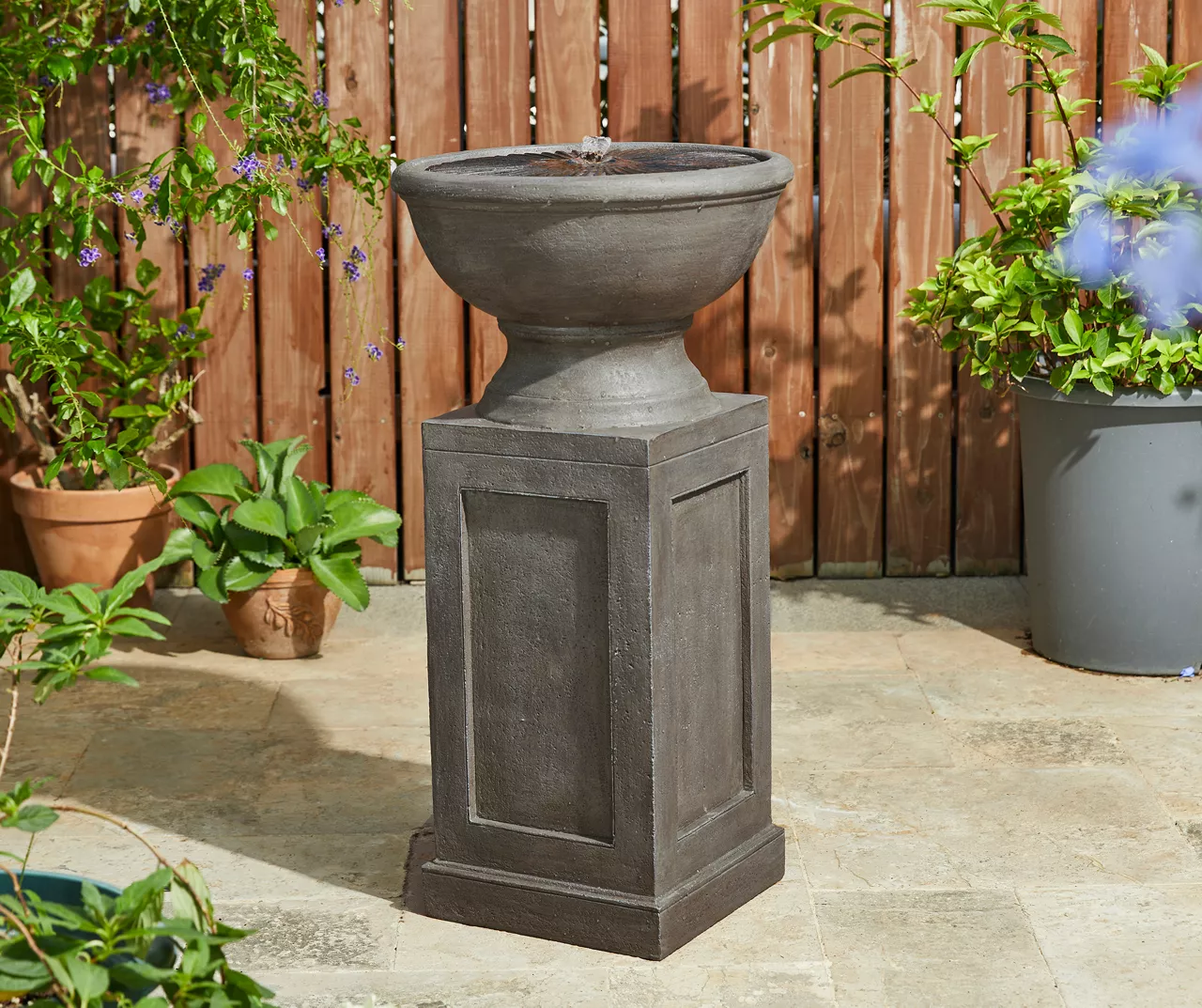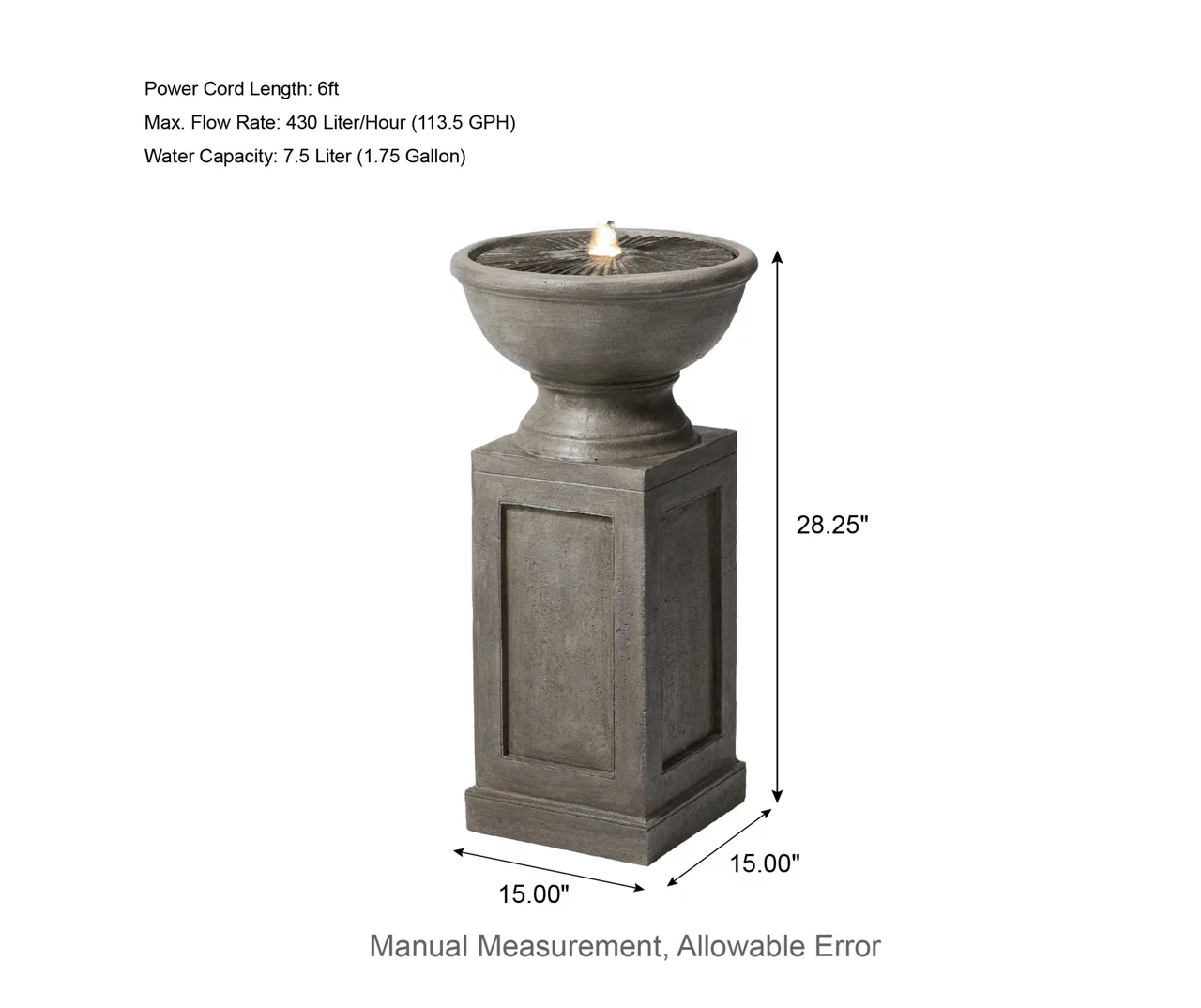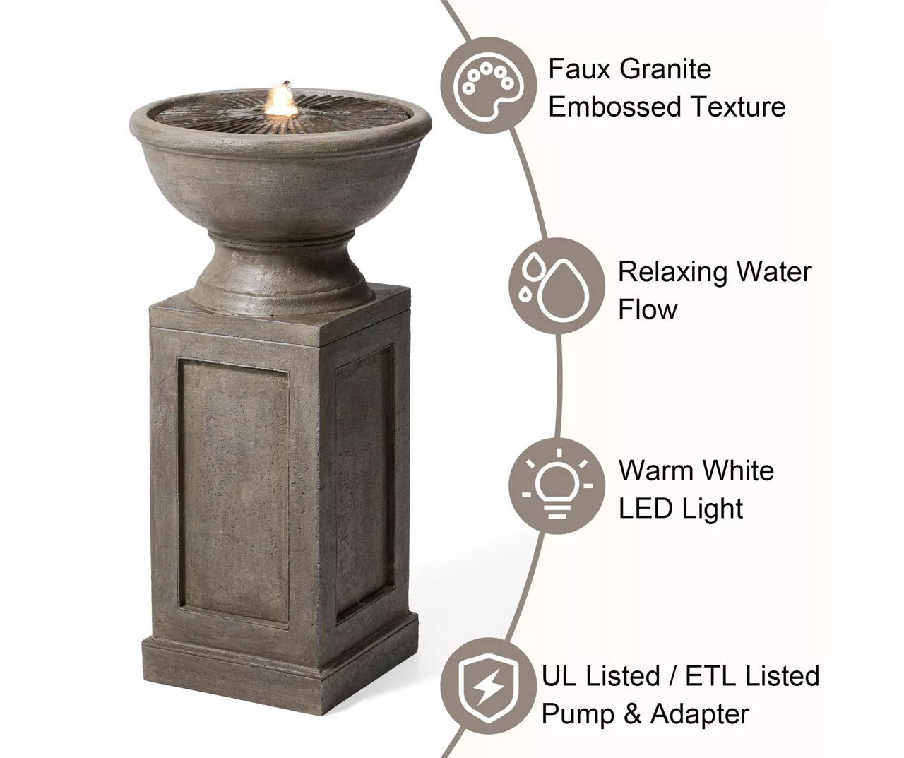 Enhance your outdoor space with this classic European minimalist geometric design pedestal birdbath fountain. It featured with faux granite embossed texture that adds a touch of artistry and natural beauty to your surroundings. Water bubbles up and spills into the pool, creating the soothing sound of cascading water to provide a relaxing and meditative atmosphere. The warm white LED light, when combined with the trickling water, ripples and sparkles in the warm glowing light.