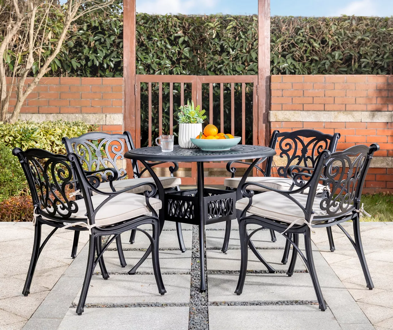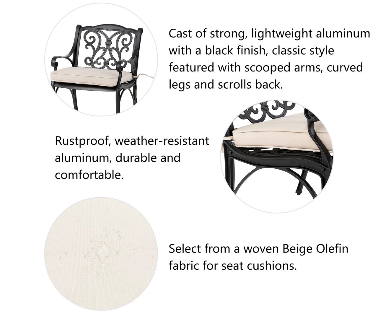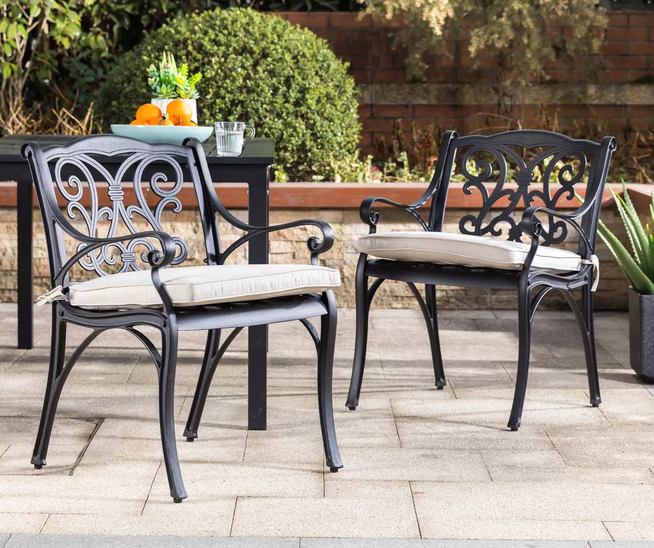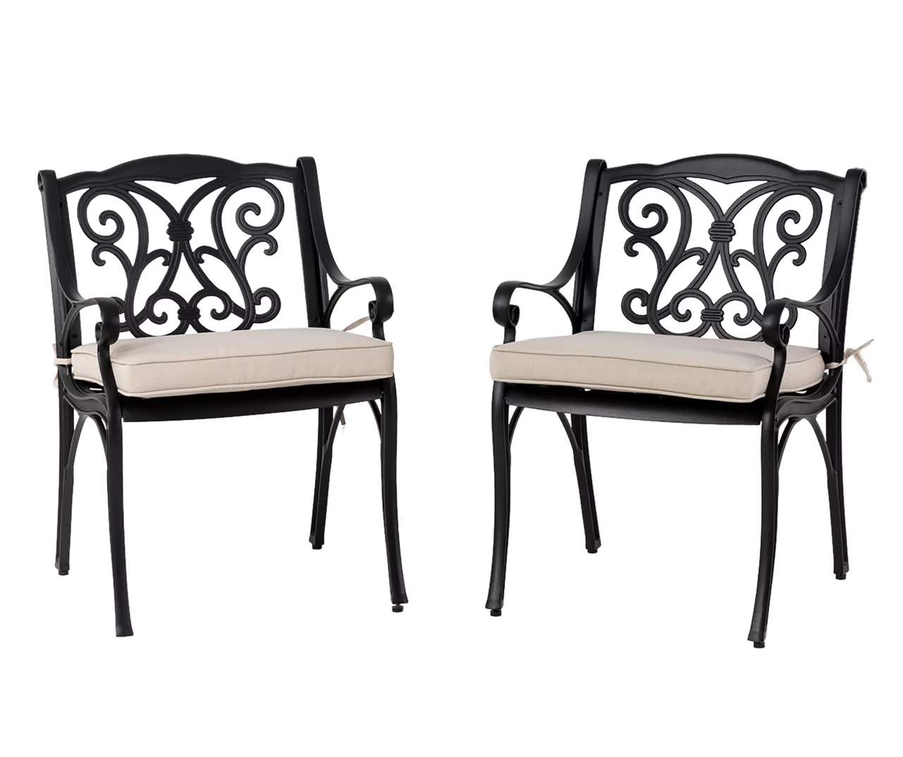 The two-piece chair set is a beautiful addition to your garden, patio, or deck. Crafted from cast aluminum, each piece showcases a powder-coated black finish that prevents wear from weather and UV rays without any maintenance. Olefin wine red cushions are included for each seat, ensuring that your family and guests stay comfortable throughout the meal. This set features an open metal weave motif with a beautiful scroll design that highlights its elegant hand-crafted details.