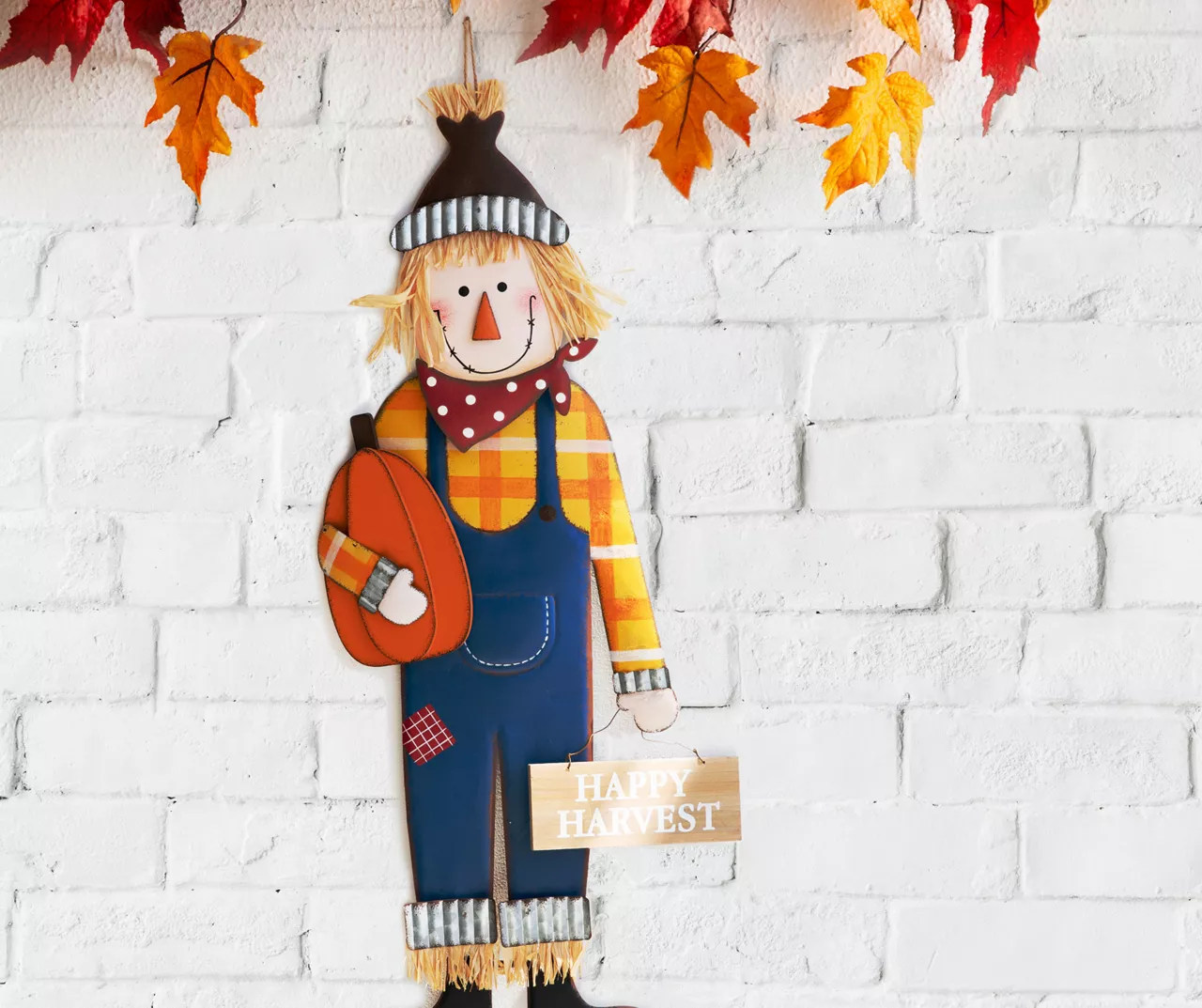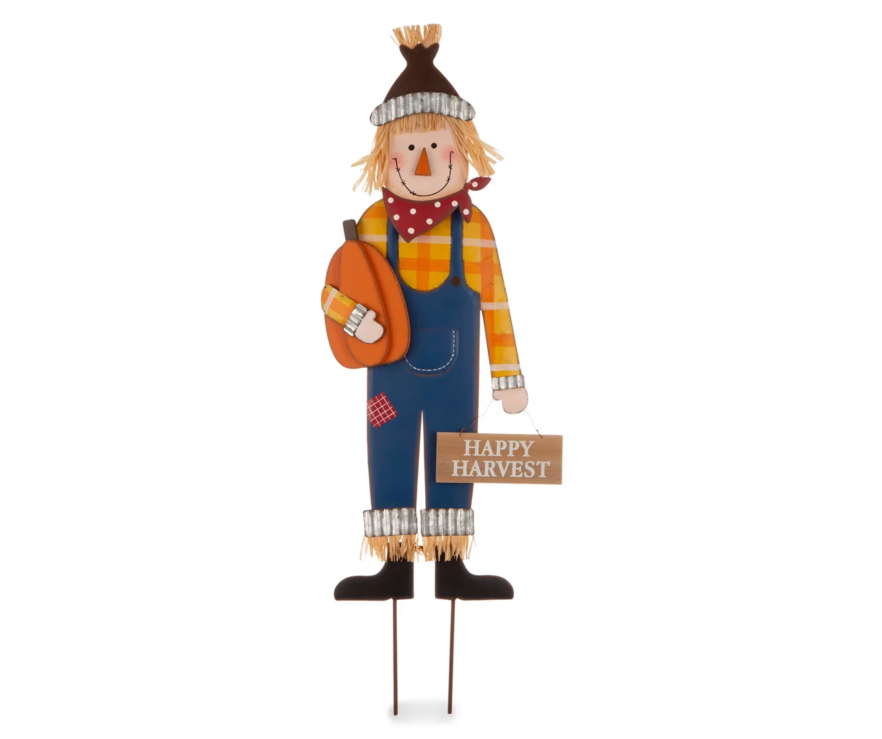 If you’re looking for a gorgeous autumn addition to your home, look no further than this cute scarecrow. Dressed in classic overalls with a hat and plaid shirt, he holds a pumpkin in his right hand and a “happy harvest” word sign in his left. Able to display as a yard stake, wall or standing décor, this piece is a fantastic addition indoors and outside.