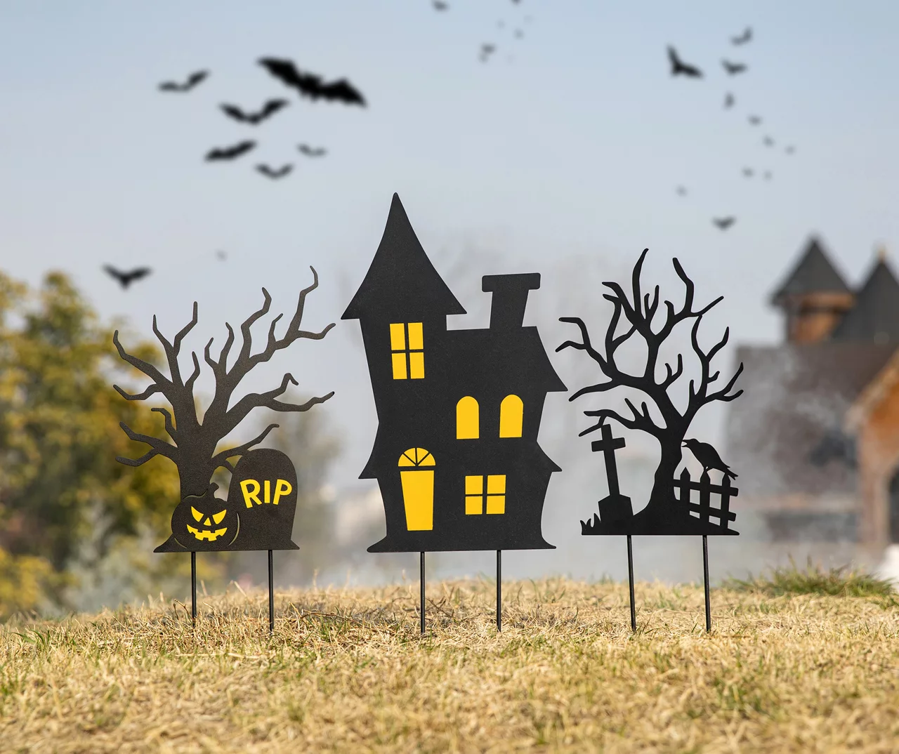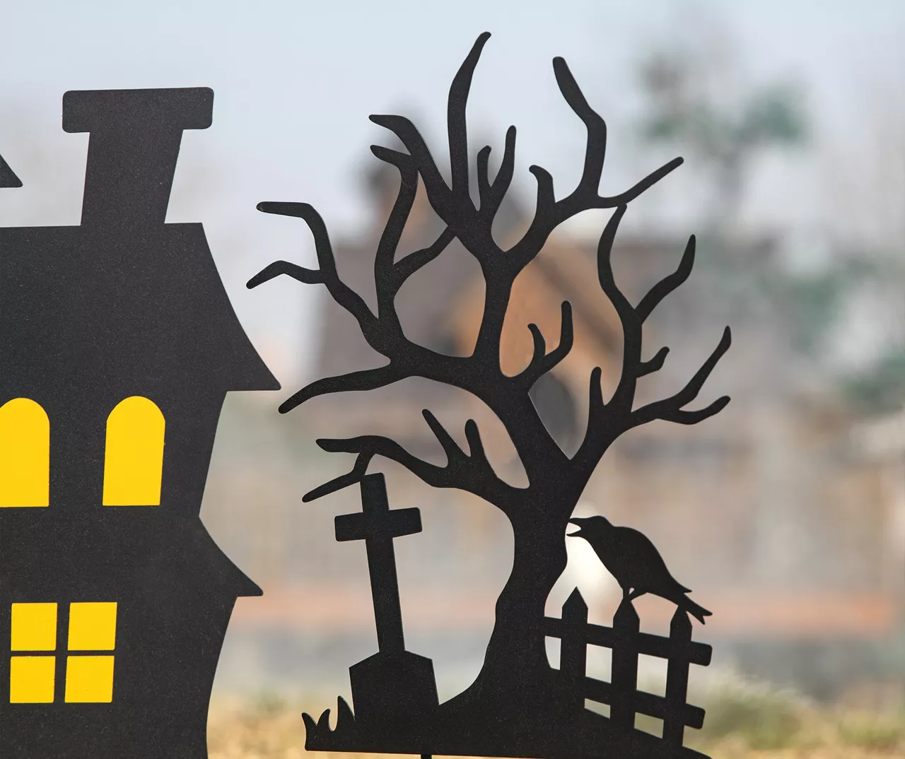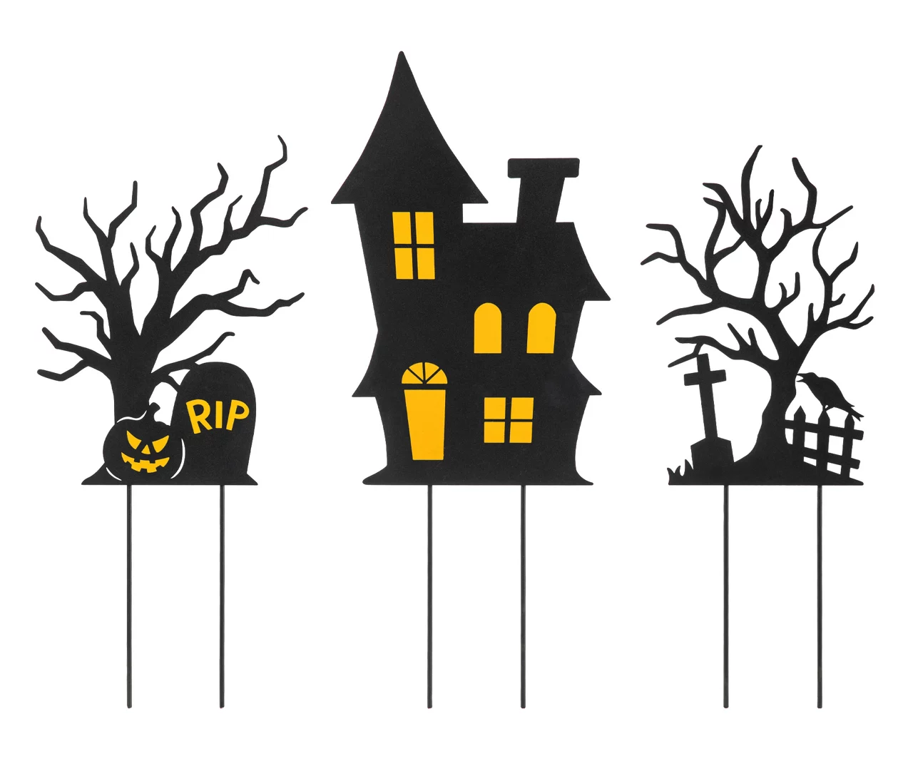 Bring a frightful sight to your yard using this three-piece stake set! A haunted house is paired with two scene trees with graveyard scenery, a raven and classic Jack O’Lantern pumpkin. This spooky set is perfect for display around a lawn or in a garden.