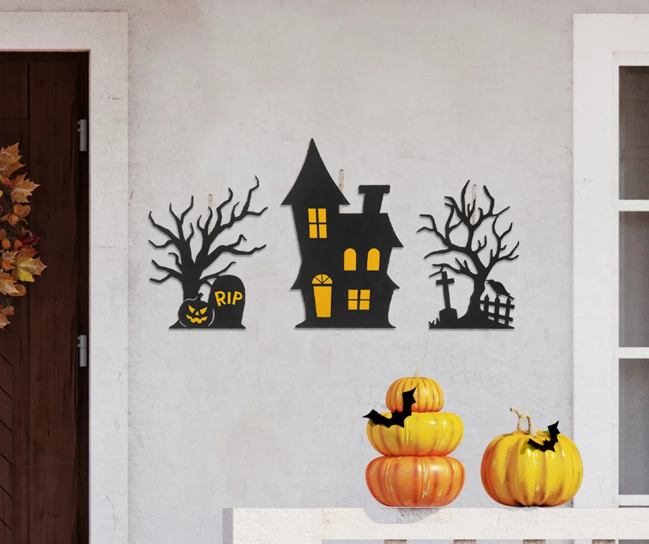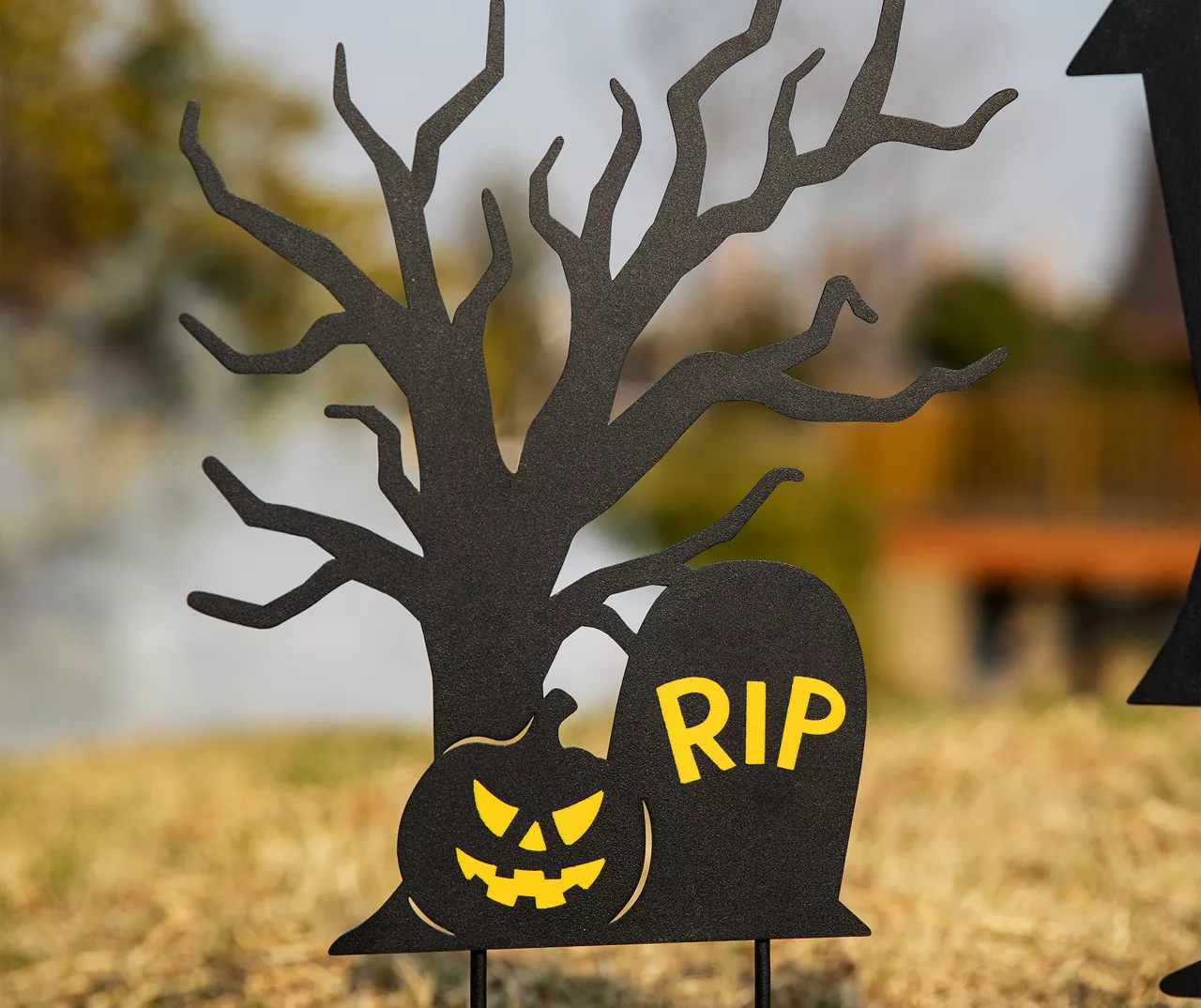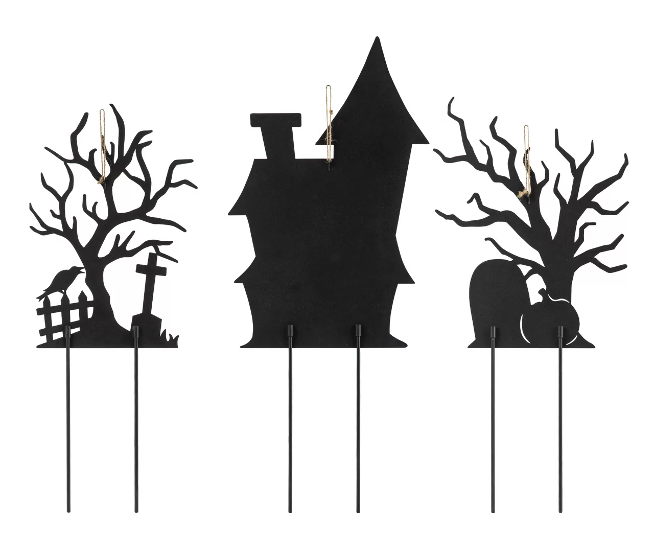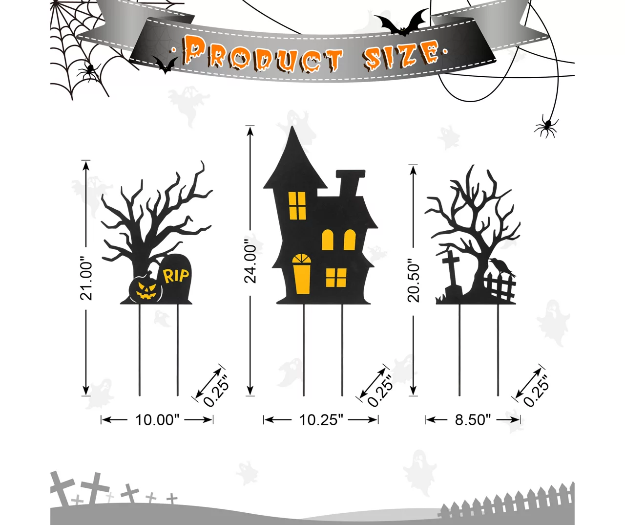 Bring a frightful sight to your yard using this three-piece stake set! A haunted house is paired with two scene trees with graveyard scenery, a raven and classic Jack O’Lantern pumpkin. This spooky set is perfect for display around a lawn or in a garden.