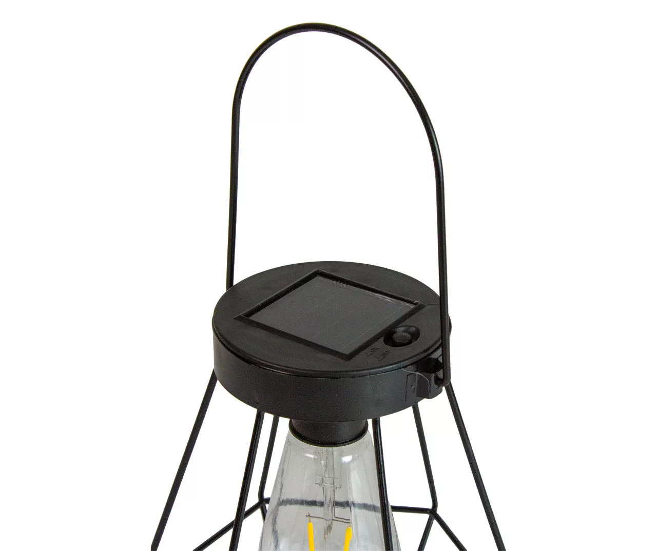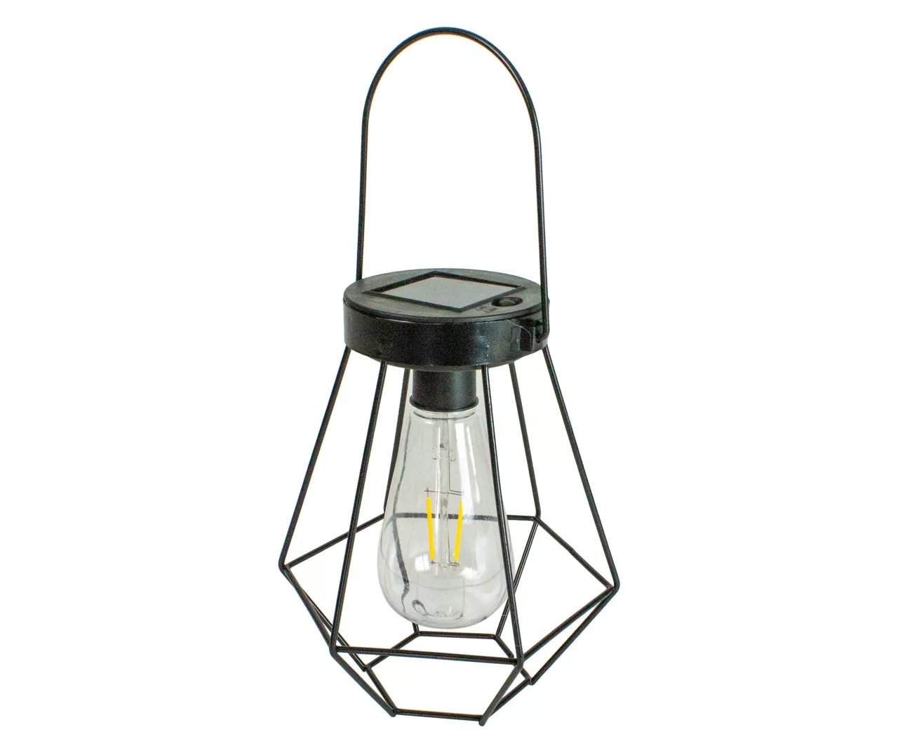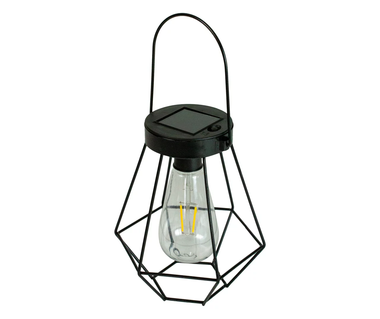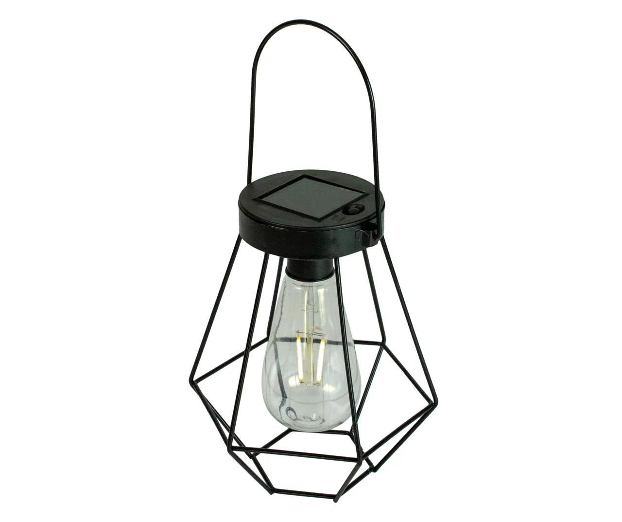 Vintage meets modern with this geometric style hanging solar lantern. This stylish lantern contains a soft white LED Edison-style bulb that is powered by a discrete solar panel on top of the light. The bulb has been designed with an intricate straight LED filament that allows for classic style combined with modern reliability and energy savings. The sleek black finish adds to the contemporary look of the lantern while also helping to prevent rust allowing for years of use.