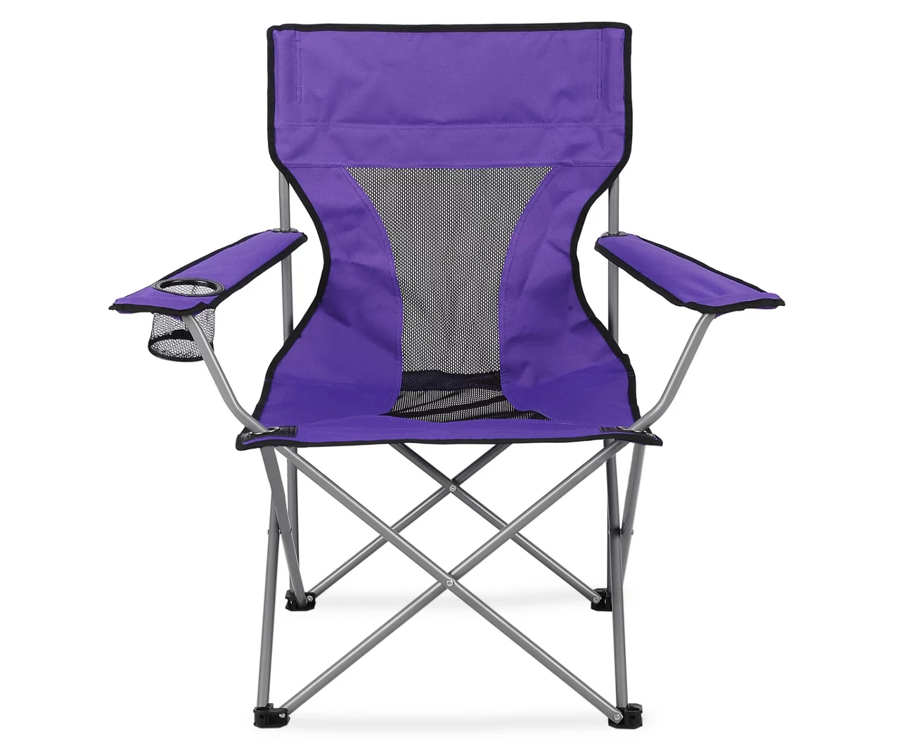 This quad camping chair features a durable steel frame and folds up into a compact, portable size. The middle mesh insert helps keep the chair dry and breathable as the armrest cup holder creates the perfect place for your favorite summertime beverage. Adorned in a rich, royal purple hue, this folding quad chair is great for outdoor seating during a barbecue, tailgate, sporting event and more.