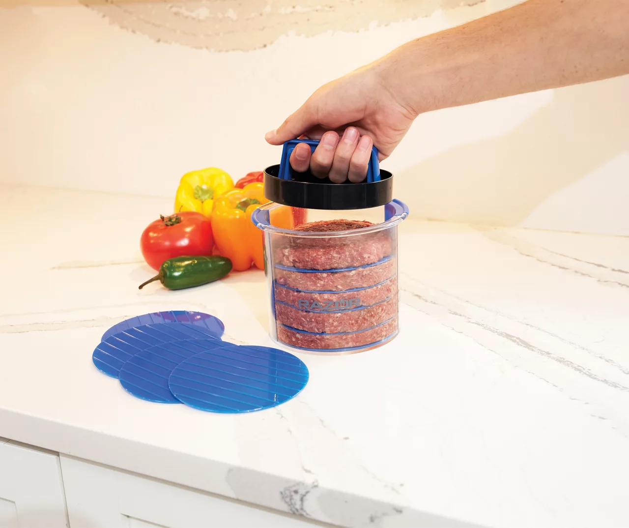 - Includes burger press, easy pull tab, storage container with lid and 8 burger dividers