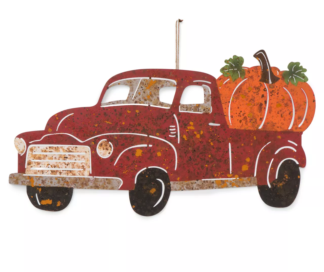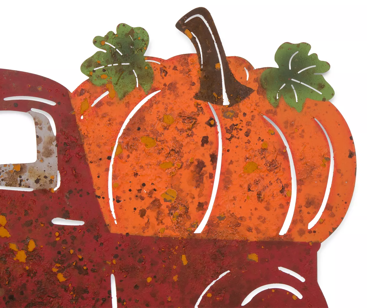 Drive your décor into fall decorating with this charming truck themed accent! Retro inspired with a red finish and carrying a large orange pumpkin in the bed, the sign features added rusted details for a complete farmhouse look. Made to hang on a wall, display upright by a stand or stake in the ground, it’s perfect for all-around harvest home decorating.