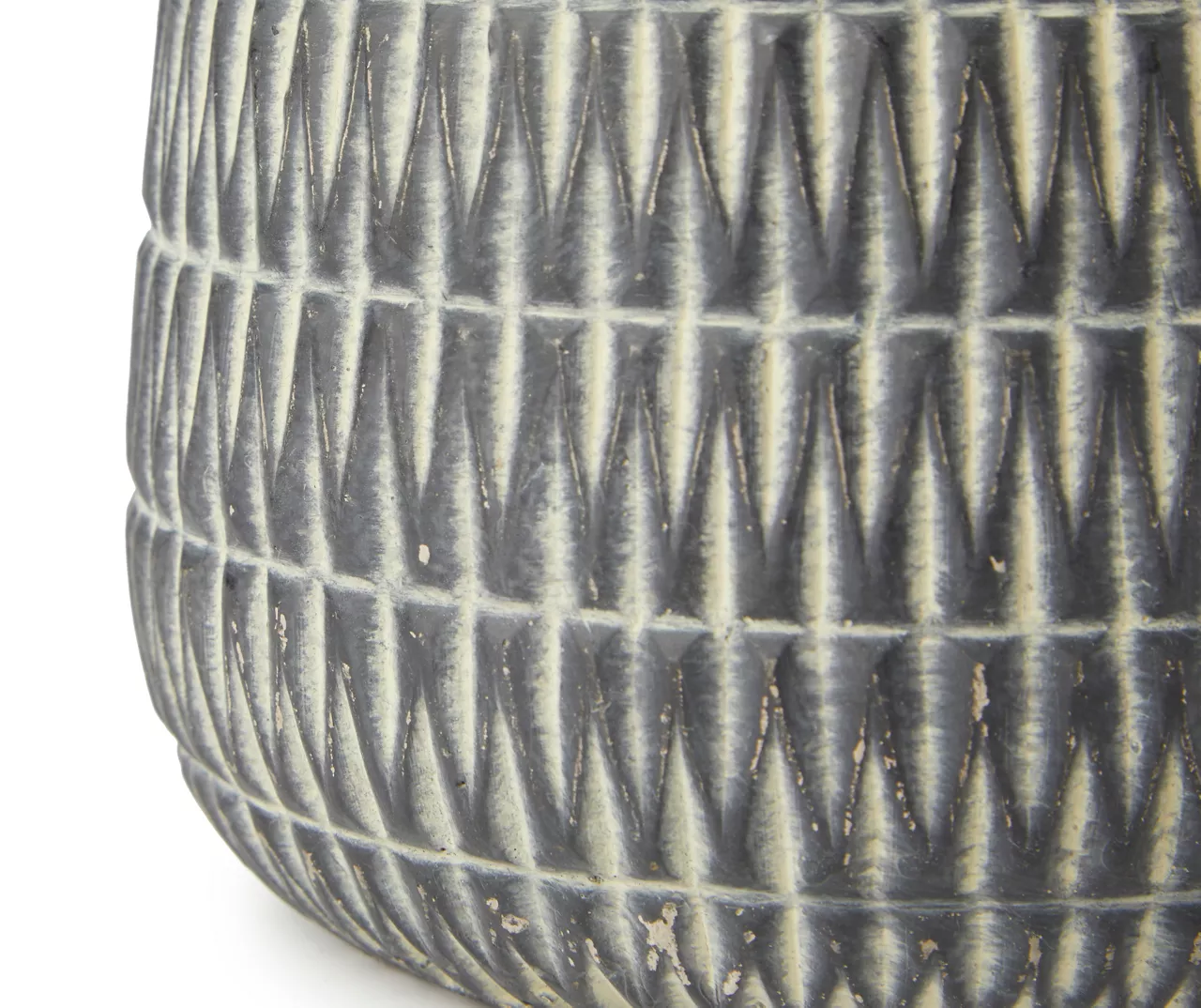 - Decorative cement pot with carved details in gray and white