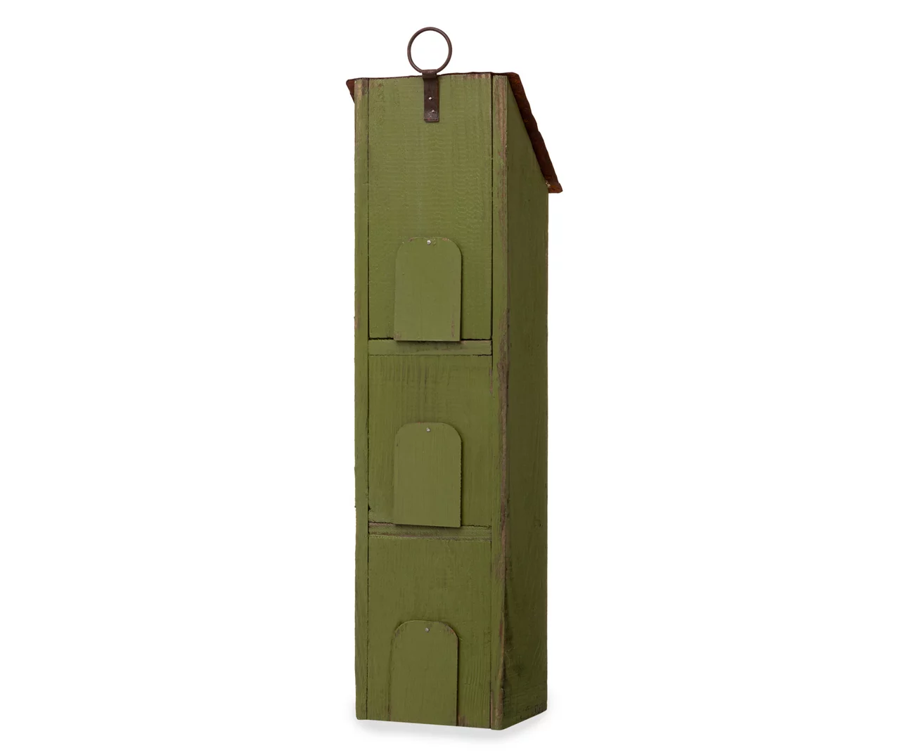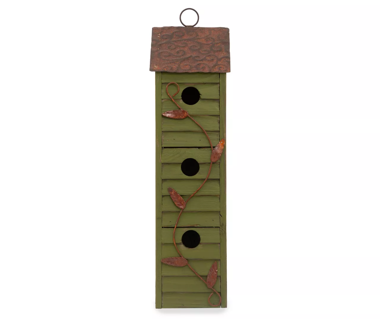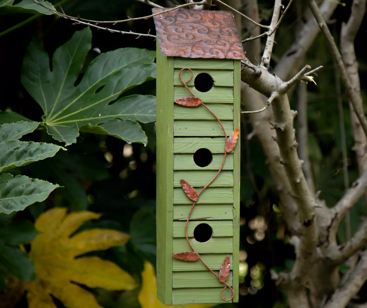 With space for three separate feathered families, this green handmade birdhouse is more like a bird apartment building. Its shingled façade is topped with a stylized metal roof and vine to add sense of beauty to your backyard.