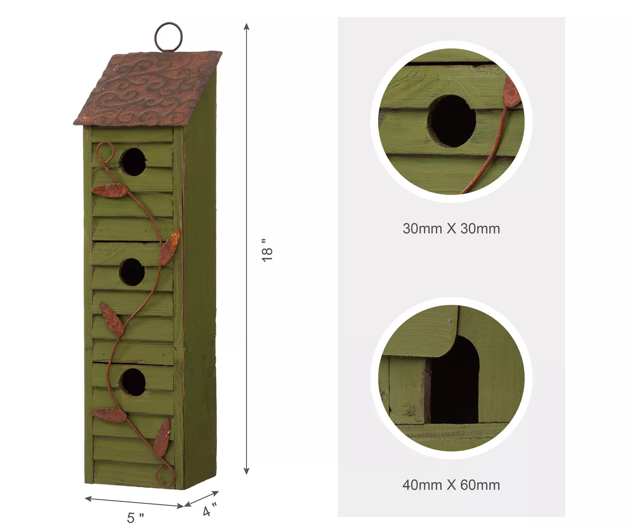 - Accommodates 3 bird nests