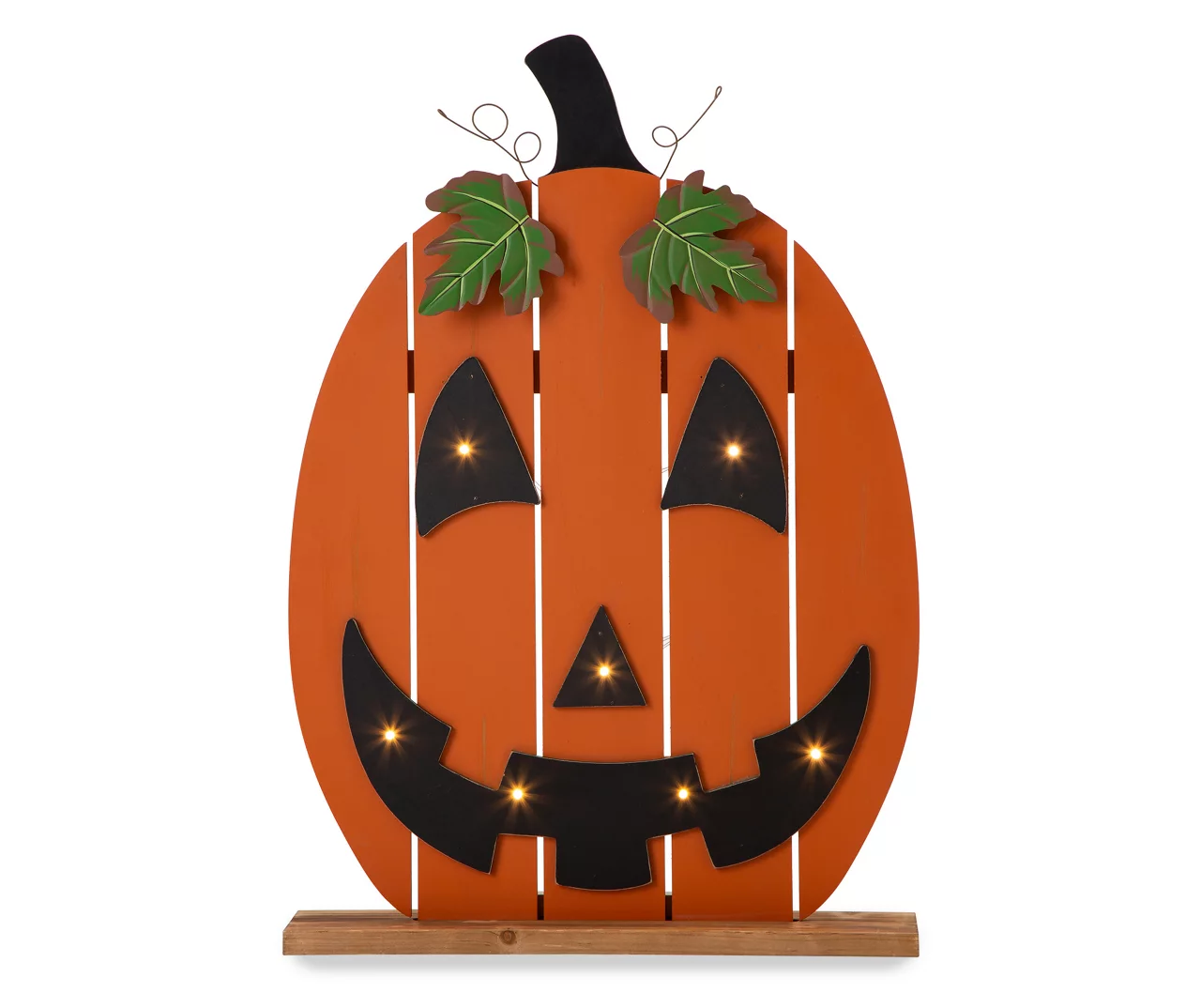 Creep out your guests with this charming piece of Halloween décor. This slatted light up jack o’lantern has an eye-catching orange color, a wooden base for stability, lovely metal leaf accents and seven stunning lights. The perfect way to brighten up your home this holiday.