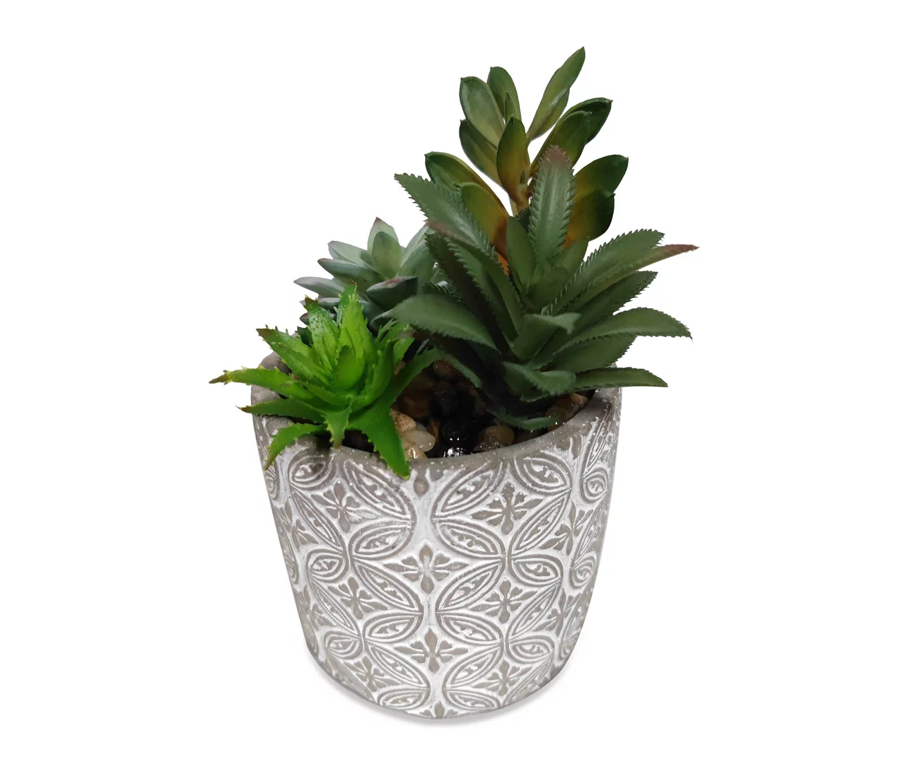 Imbue your home with the charm of the great outdoors with this artificial plant. Elegantly resting in a stylish, engraved cement pot, the arrangement of faux succuelents adds nature-inspired interest to a space with unique sizes, types and colors.