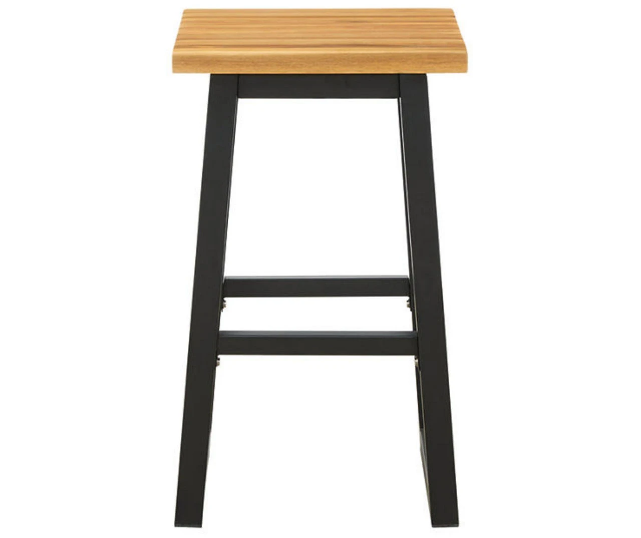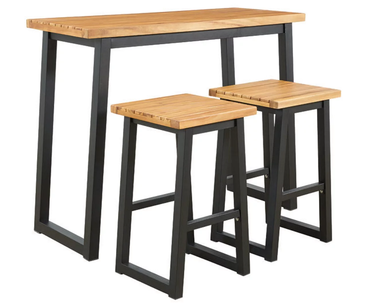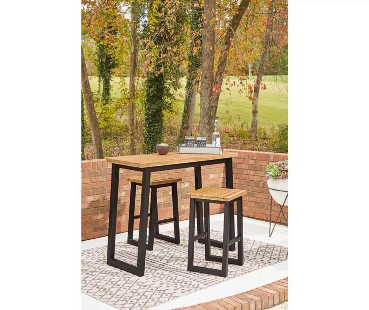 Bring an uptown feel to an outdoor space with this outdoor furniture set. An especially smart choice for small spaces, this ultra-cool counter height outdoor table and bar stool set a new standard in outdoor living. The tabletop and seats are richly crafted of acacia wood with wonderful tonal variation. Tubular steel legs are sleek, sturdy and slightly canted for an interesting angled effect.