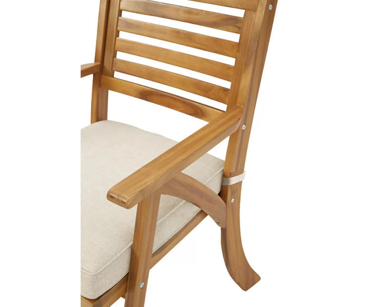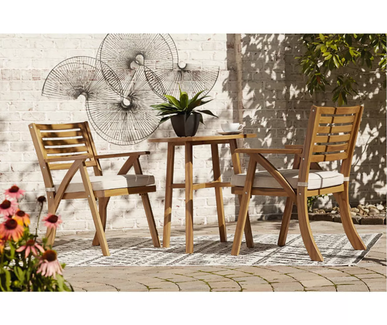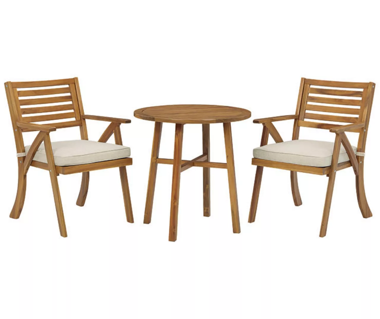 Turn an outdoor space into your own private oasis with this bistro set. The essence of easy-breezy outdoor living, this brilliantly styled bistro set is quality crafted of acacia wood in a natural teak tone for an exotic element. Delightfully low-maintenance seat cushions wrapped in Nuvella fabric perfect the aesthetic.