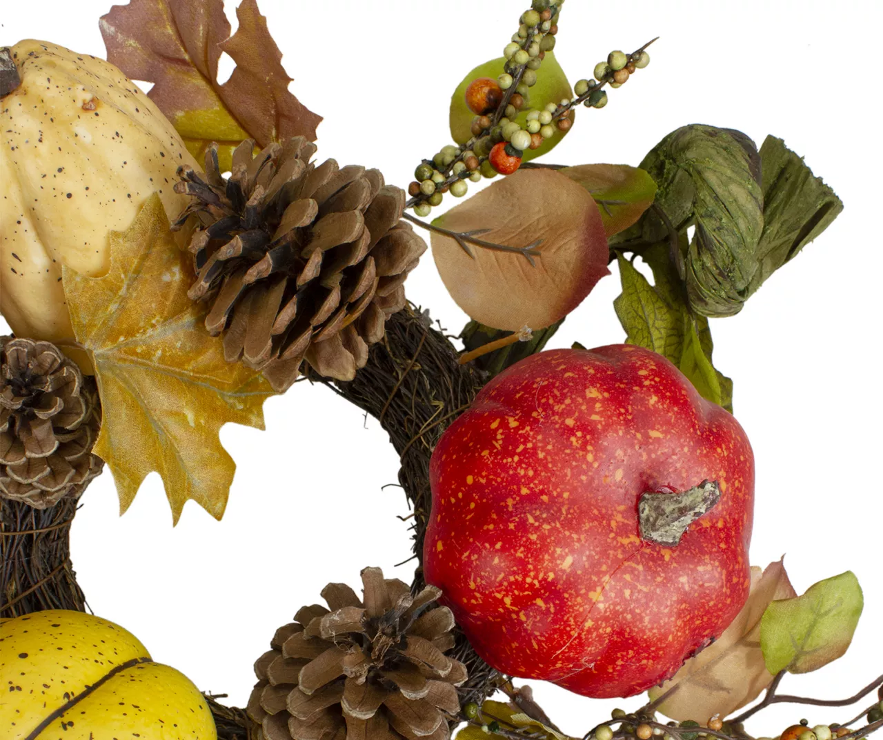 This gorgeous harvest wreath from Northlight provides all the wonderful colors of autumn. Foliage in oranges and greens are the backdrop for red, orange and yellow pumpkins, berries and real pine cones. It’s perfect for hanging or can be used as part of your thanksgiving table centerpiece. ProA sturdy twig backing makes for easy hanging (hardware not included).